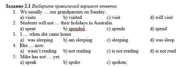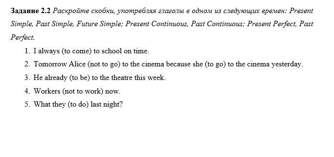 1. I always come. 2. Won't go, went. 3. Has been. 4. Aren't working. 5. What did they do.