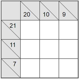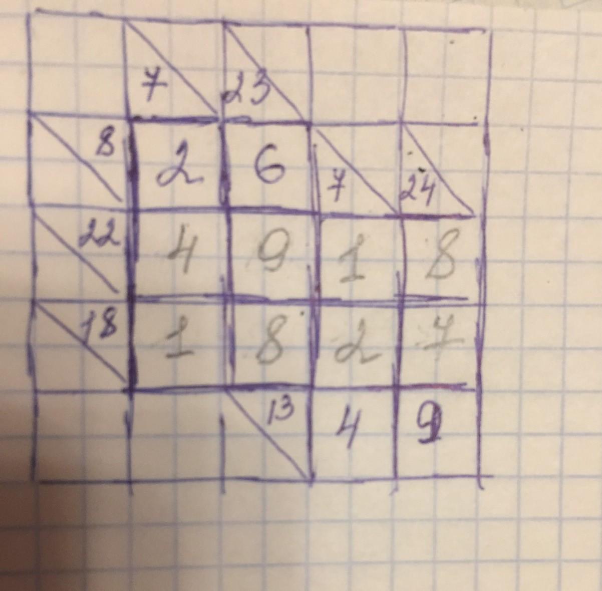 Разгадайте какуро: запишите в белые клетки числа от 1 до 9 включительно, правое верхнее значение означает сумму чисел в строке, а значение снизу слева равно сумме чисел в столбце, одинаковые числа в одной строке и в одном столбце записывать нельзя. Какое число будет записано в нижней строке в угловой клетке справа?