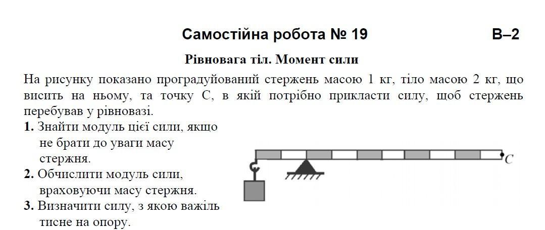 Самостійна робота № 19 PH2 Рівновага ти. Момент сили На рисунку показано програму имований стержень заоби 1, тіл зарли 2 , и висить на ньому, а ичижу С, в якій потрібно прикласти сигу, и стержень перебував у рівновазі. 1. Знайти можу я, 113) сили, яко ие бухати мо уваги масу сердия, 2. Обчислити модуль сили, враховукчи эмасу стержня 3. Визначити силу, з якои важіль 1 Исме на 9119