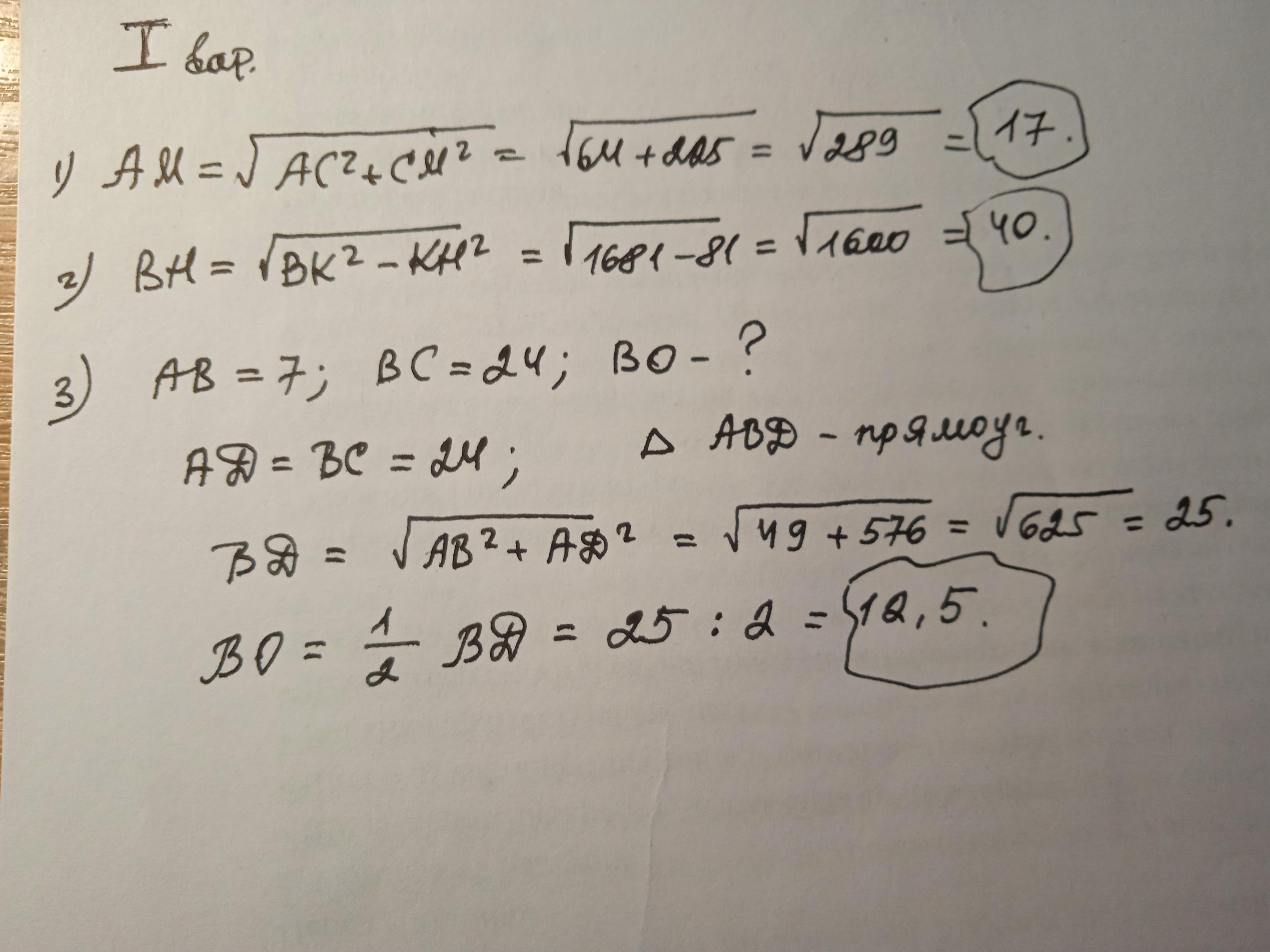 2) ВН=√17^2-8^2=15