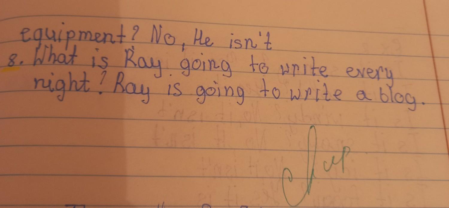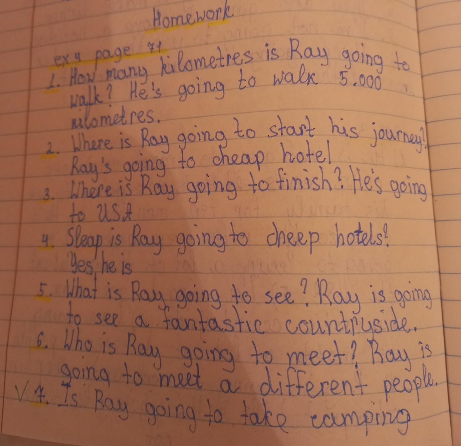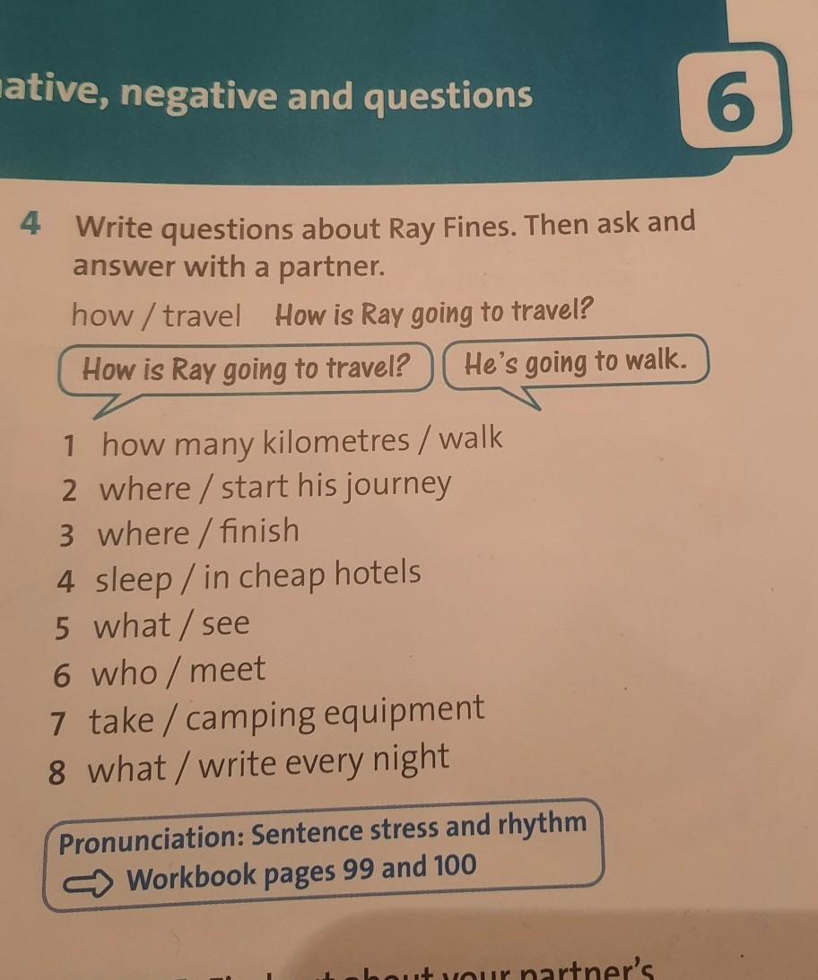 4 Write questions about Ray Fines. Then ask and answer with a partner. how / travel How is Ray going to travel? How is Ray going to travel? He's going to walk. 1 how many kilometres / walk 2 where / start his journey 3 where / finish 4 sleep/in cheap hotels 5 what / see 6 who / meet 7 take / camping equipment 8 what/ write every night