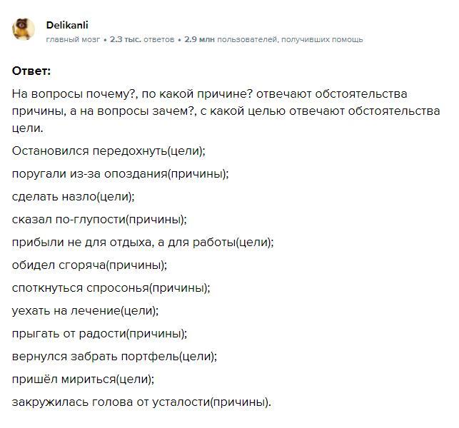- Определите, какие обстоятельства отвечают на вопросы Почему? ПО какой причине?, а какие – на вопросы зачем? с какой целью? Укажите их значения. Имейте в виду, что обстоятельства цели могут быть выра- жены и инфинитивОМ. Остановился передохнуть; поругали из-за опоздания; сделать назло; сказал по-глу- пости; прибыли не для отдыха, а для работы; обидел сгоряча; споткнуться спросонья, уехать на лечение; прыгать от радости; вернулся забрать портфель; пришёл мириться, закружилась ГОЛОва от усталости.