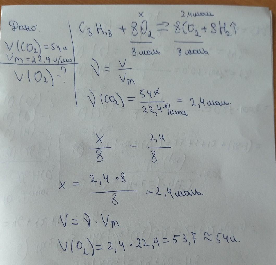 який обєм (н.у.) кисня втрати на спалювання переведеного у газоподібний стан октану якщо при цьому утворилось 54л (н.у.) вуглекислого газу. СРОЧНО К.Р
