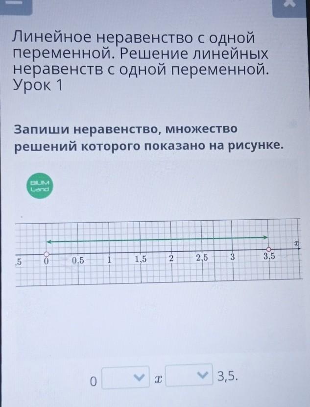 Запиши неравенство, множество решений которого показано на рисунке. BILIM Land 51 0 0.5 1 сл 1,5 2 2.5 3 3,5 Mх о ✓ 3,5. задание на фото