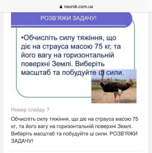 Обчисліть силу тяжіння, що діє на страуса масою 75