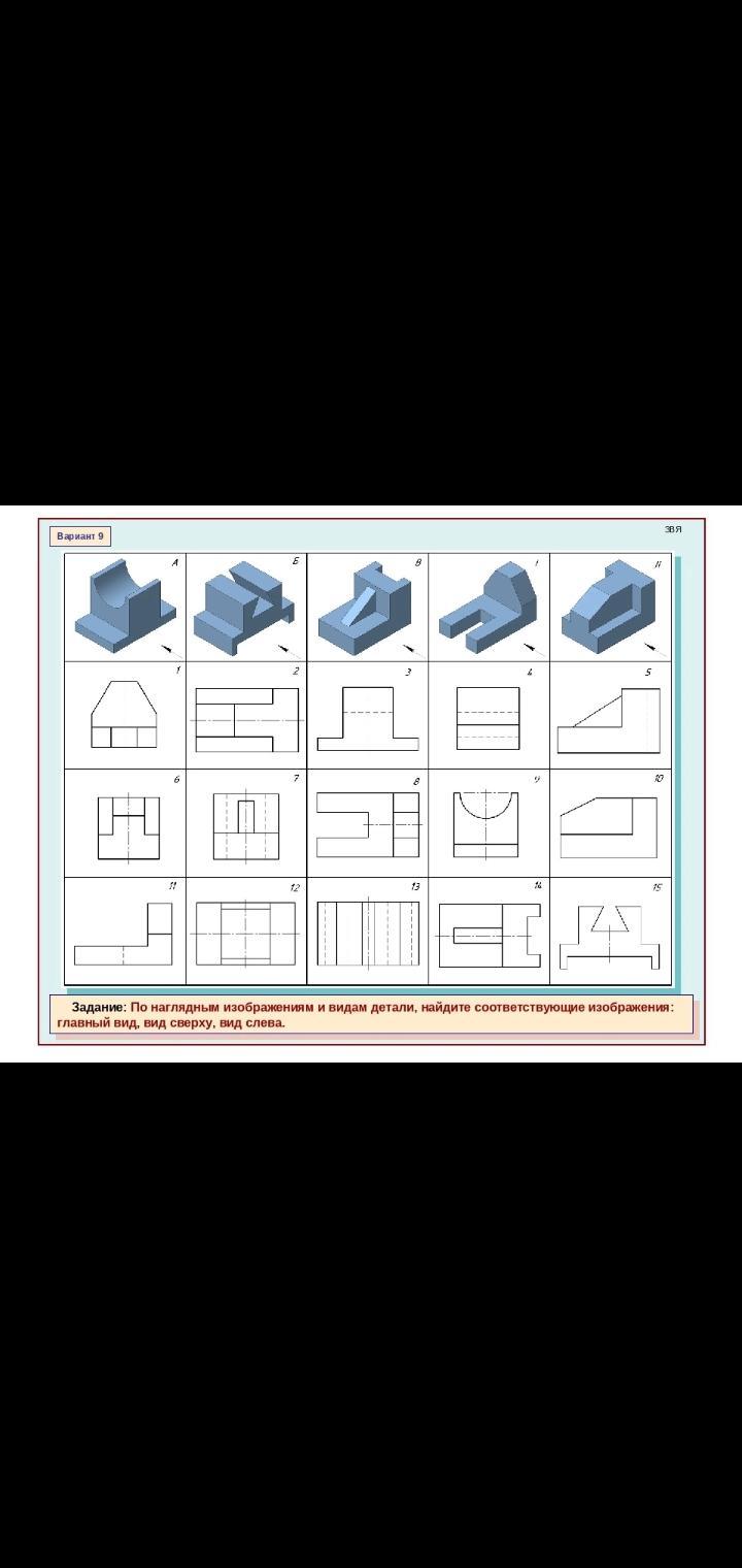 Срочно ребят дам 50 баллов . По наглядным изображениям и видам детали , найдите соответствующие изображения главный вид , вид сверху , вид слева