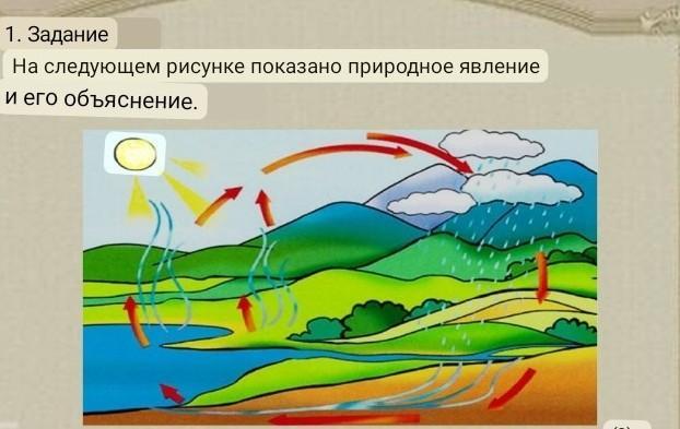 Солнце нагревает воду в океанах и морях, и она испаряется, преобразуясь в водяной пар. Затем образуются тучи, вода обрушивается на землю дождем и возвращается обратно в водоемы.