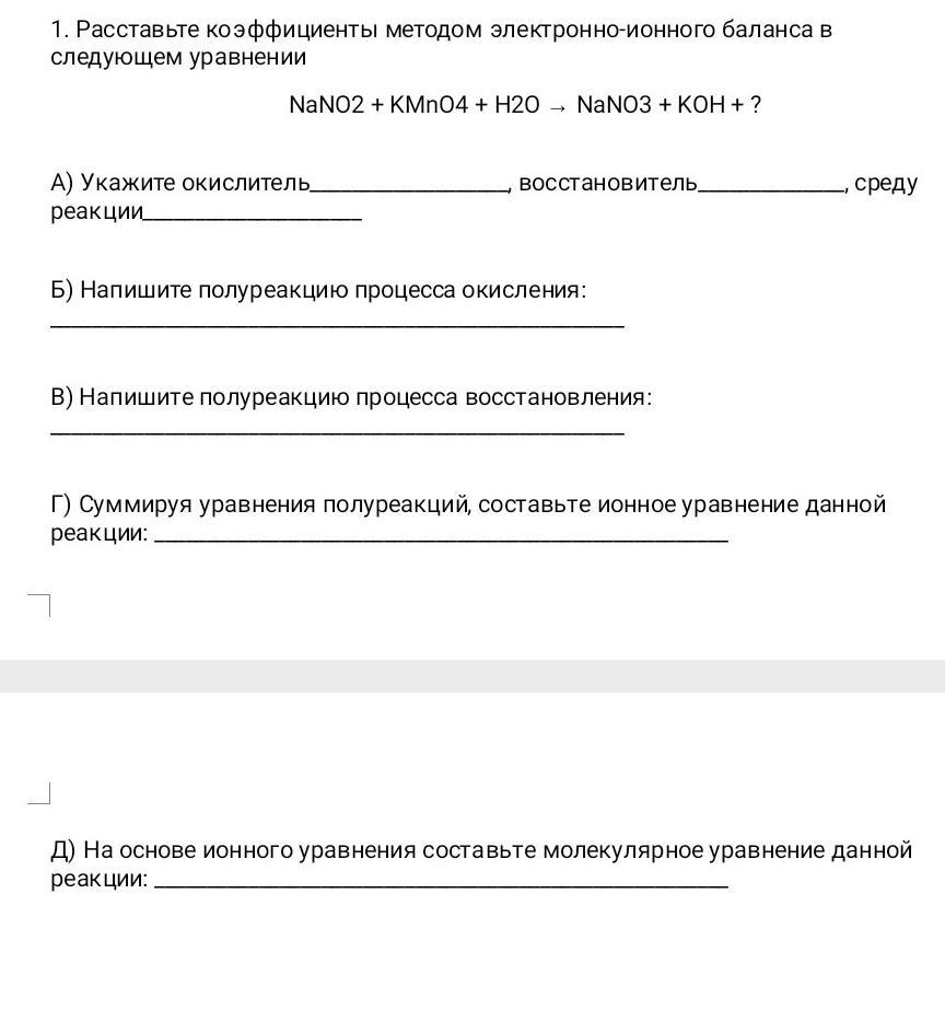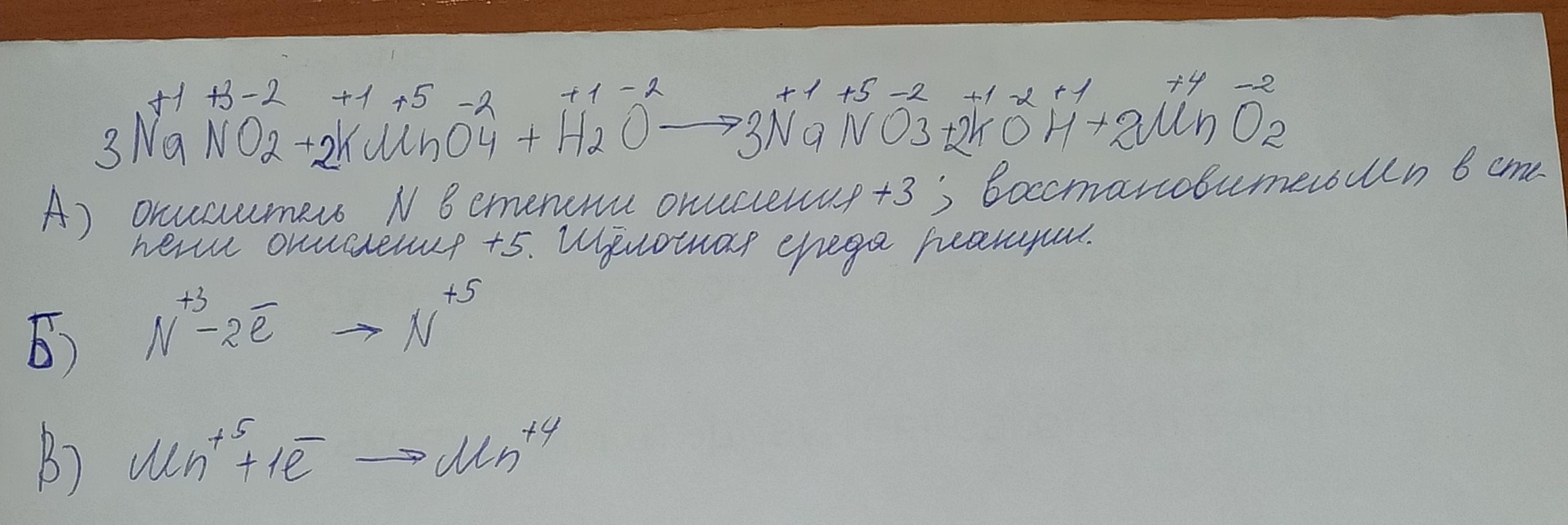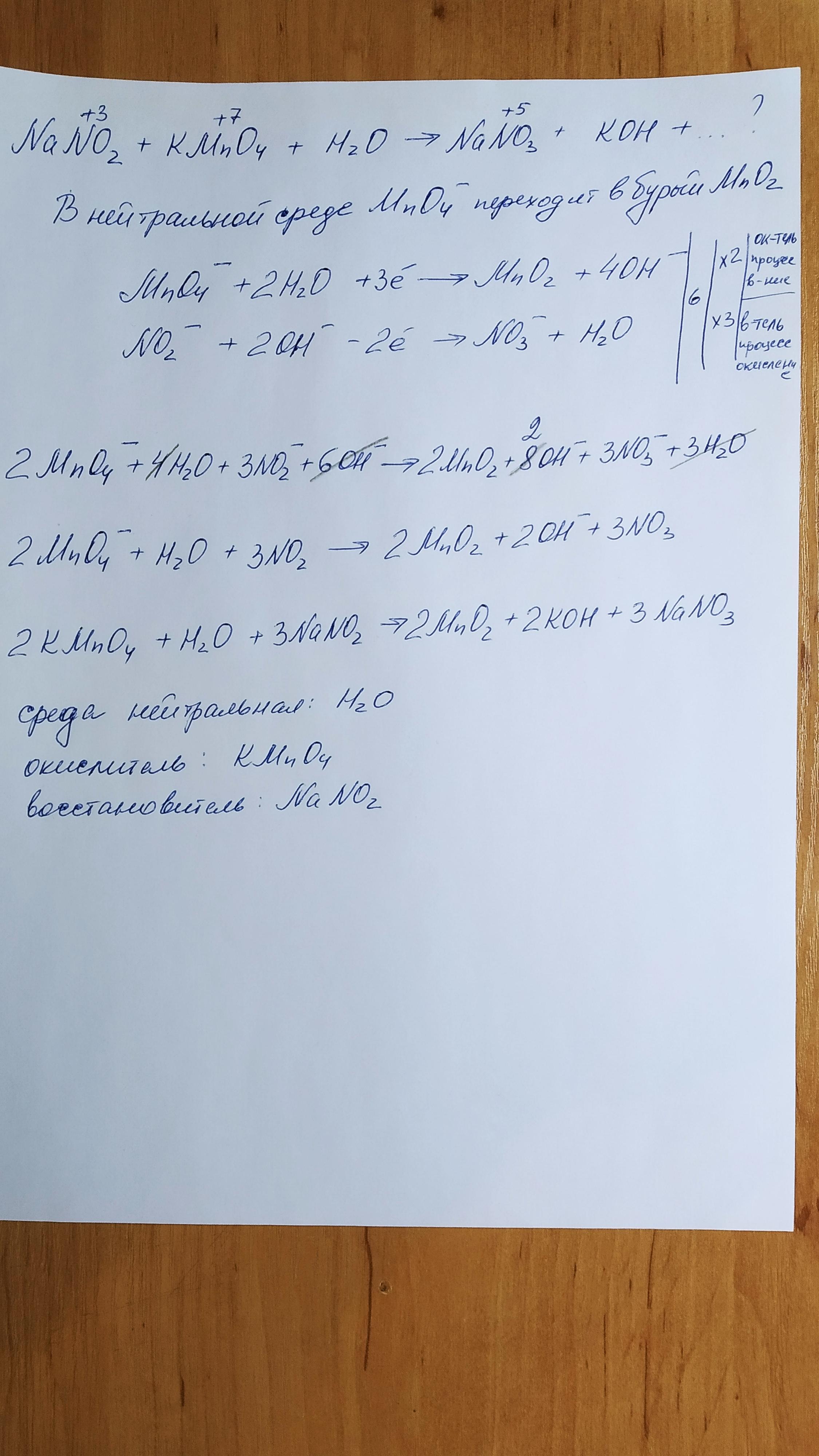 Расставьте коэффициенты методом электронно-ионного баланса следующем уравнении nano2 + kmno4 + h20 … nano3 + koh +?
