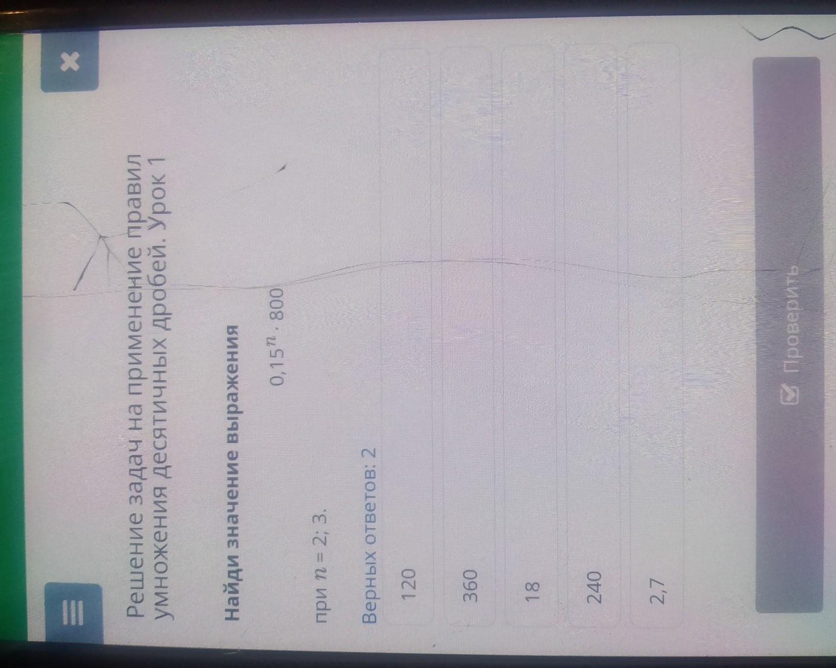 Решение задач на применение правил умножения десятичных дробей. Урок 1 Найди значение выражения 0,151.800 при п = 2; 3. Верных ответов: 2 18 2,7 - 120 360 240 помогите пж срочно