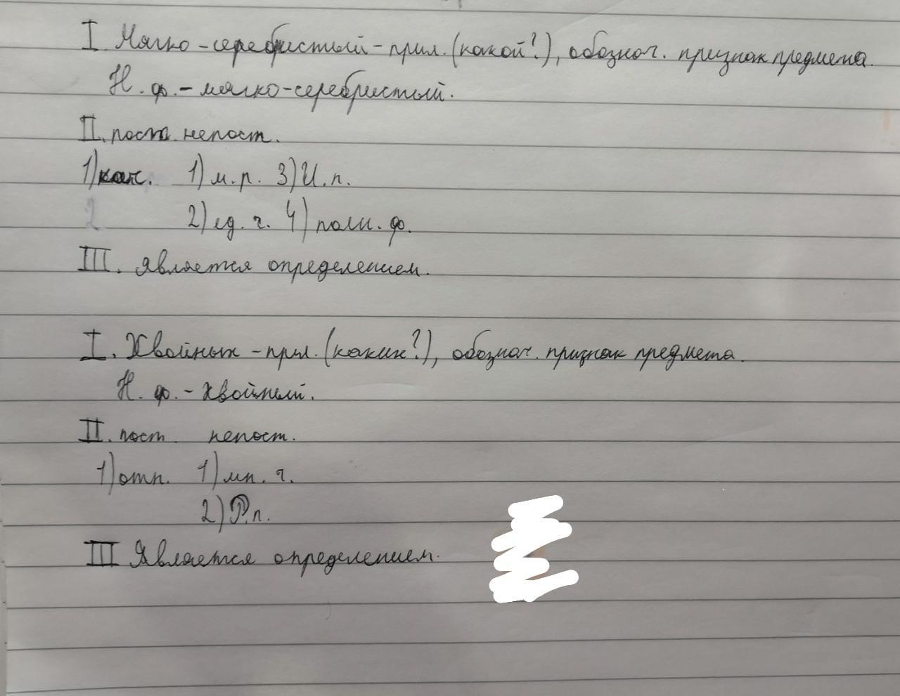 сделайте морфологический разбор двух любых прилагательных из текста----------------> Мягко-серебристый свет луны проникает сквозь черно-изумрудную крону хвойных деревьев и тихо освещает бело-синие сугробы тайги