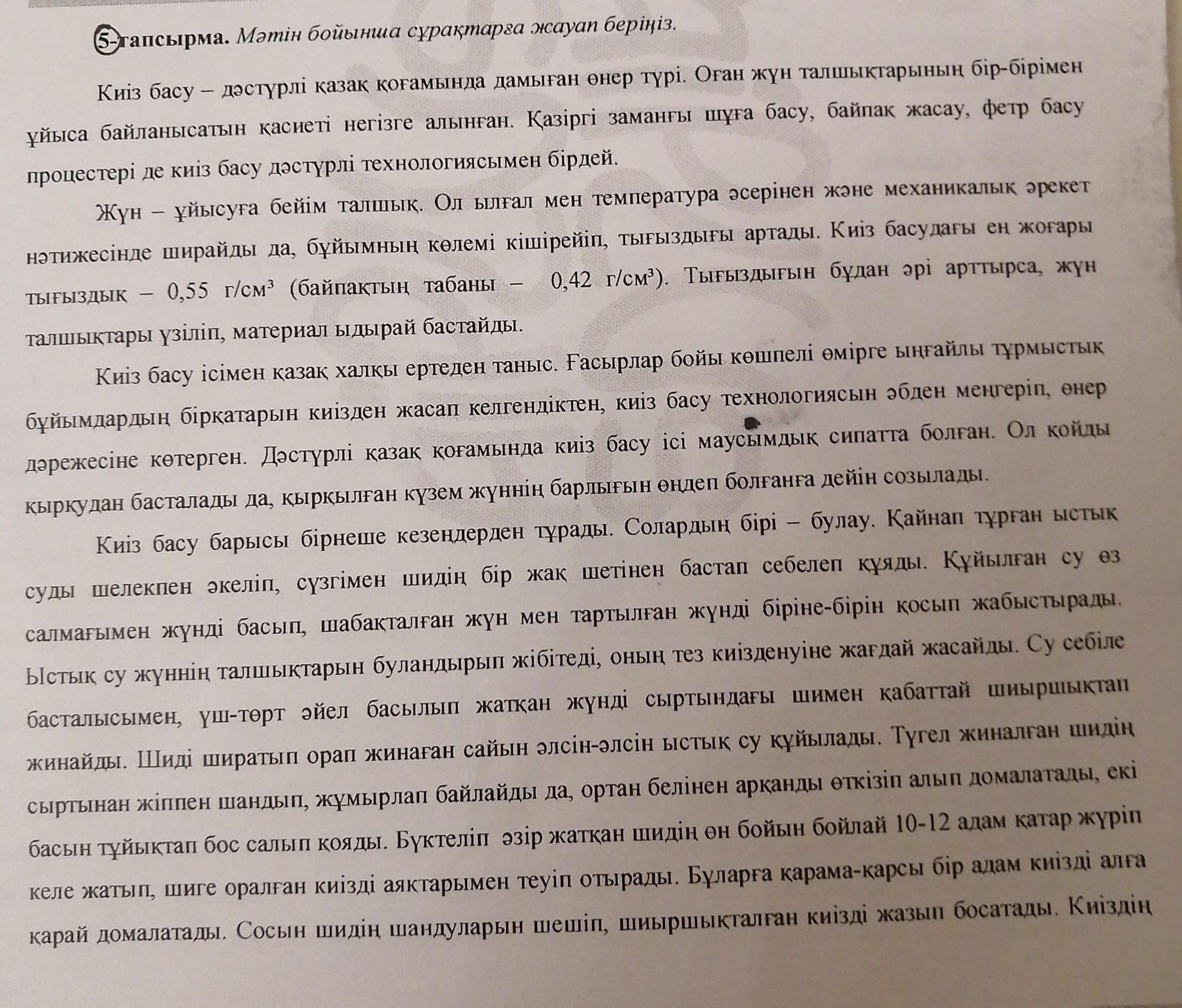 Жауап N Сұрақ 1 Механикалық әрекет нәтижесінде ширайтын зат 2. Киіз басуға қажетті зат 3 Жүн талшықтарының үзіліп, материалдың ыдырай бастау себебі 4 Киіз басудың булау кезеңіне қатысты дұрыс ақпарат 5 Мәтін мазмұны бойынша маусымдық сипат алған дәстүр 6 Киізді булау кезінде қолданылатын негізгі зат