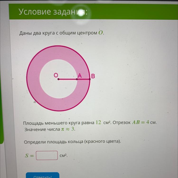 Площадь кольца равна площади всего круга минус площади маленького круга= 108-12=96