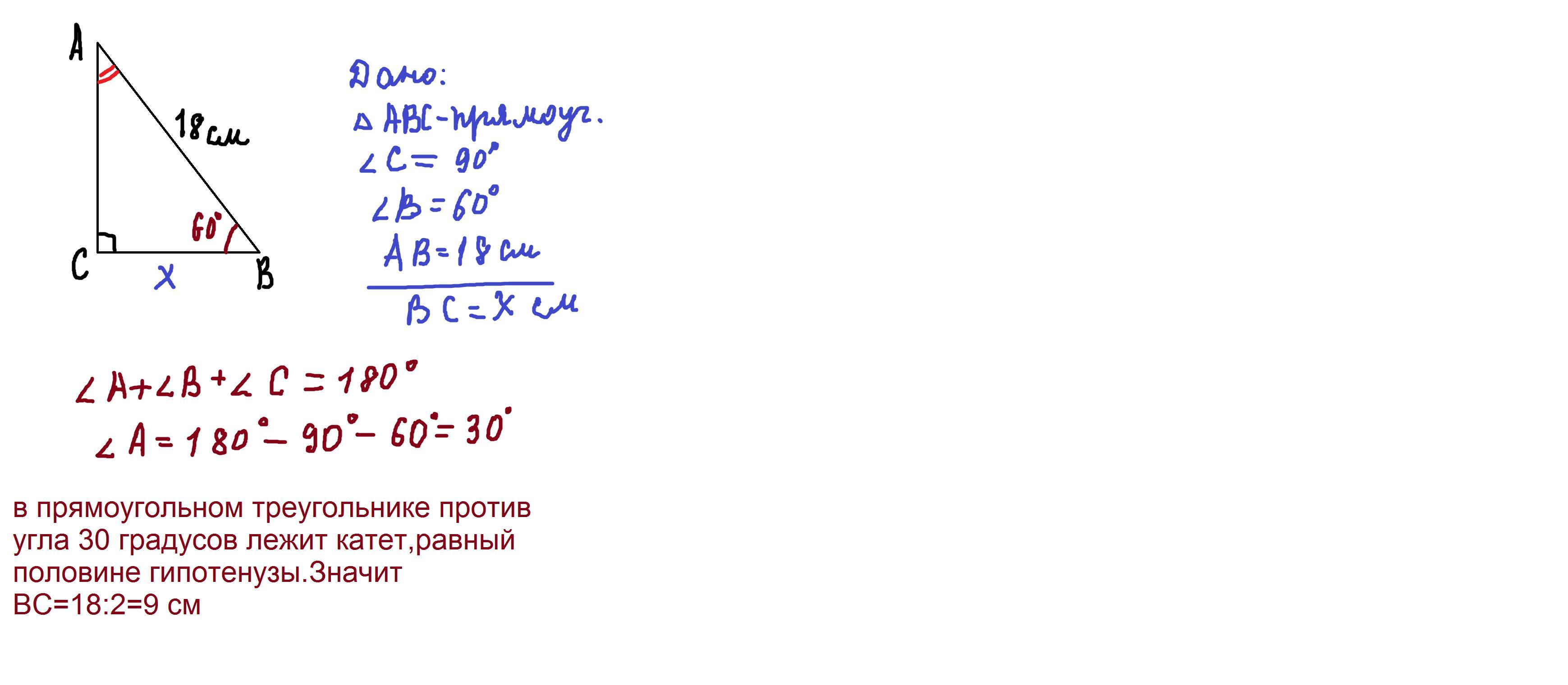 Знайти катет , прилеглий до кута 60° у прямокутному трикутнику з гіпотенузою