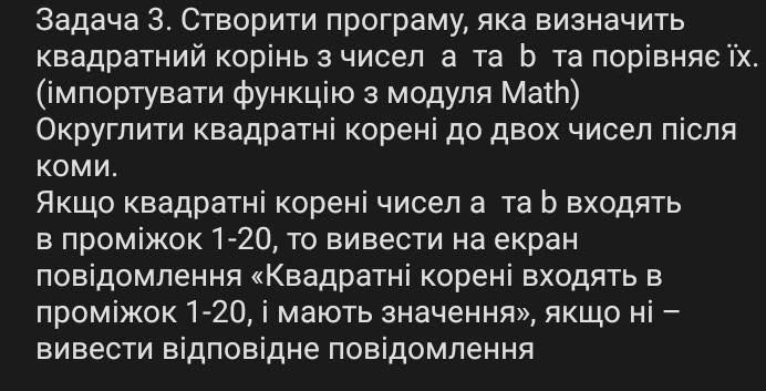 print(f"Квадратнi коренi{'' if 1 <= a_sqrt <= 20 and 1 <= b_sqrt <= 20 else ' не'} входять в промiжок 1-20, i мають значення", end=" ")