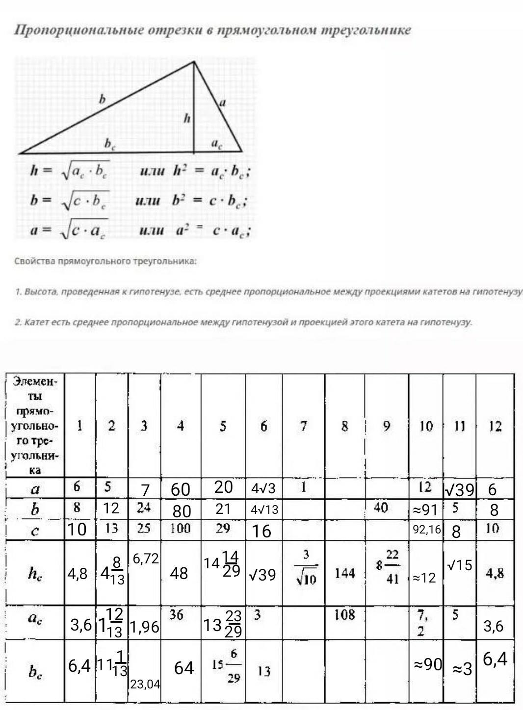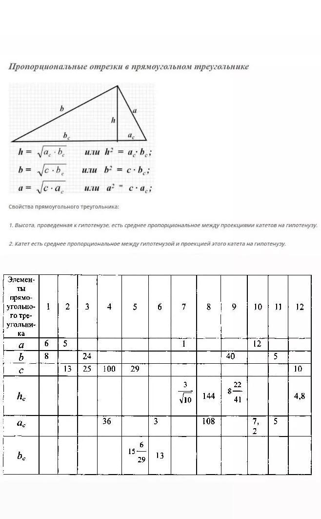 Помогите пожалуйста. Без спама. Таблица по теме: пропорциональные отрезки в прямоугольном треугольнике. Заполните таблицу , очень нужно