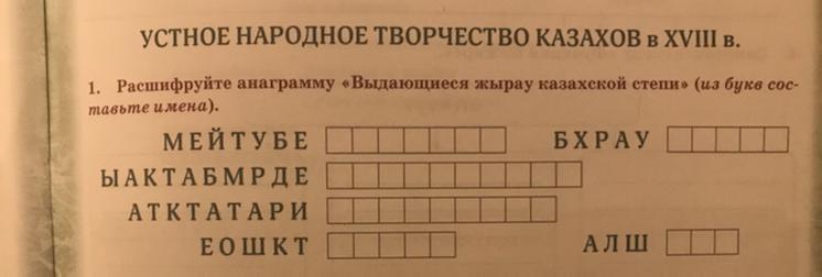 Расшифруйте анаграмму «Выдающиеся жырау казахской степи» (из букв сос-