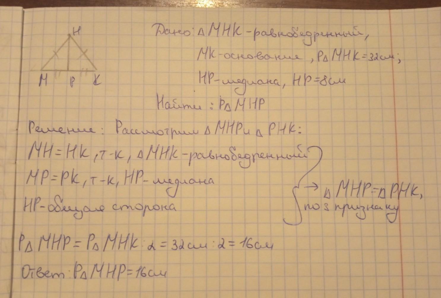 В равнобедренном треугольнике MHK с основанием MK длина его медианы HP равна 8 см. Периметр треугольника MHK равен 32 см. Чему равен периметр треугольника MHP.