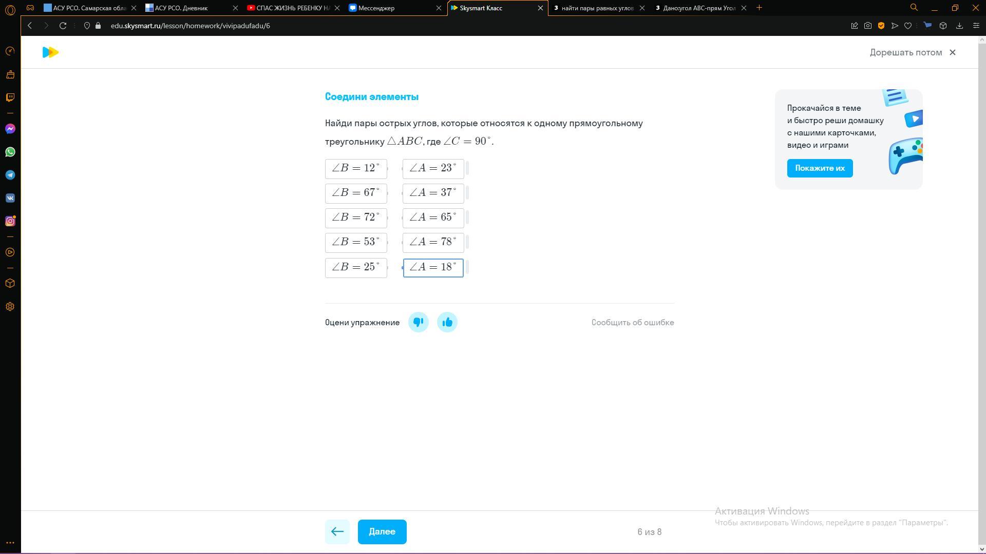 и последующие ГРАДУСЫ B вычитаем из 90 и получаем градус A