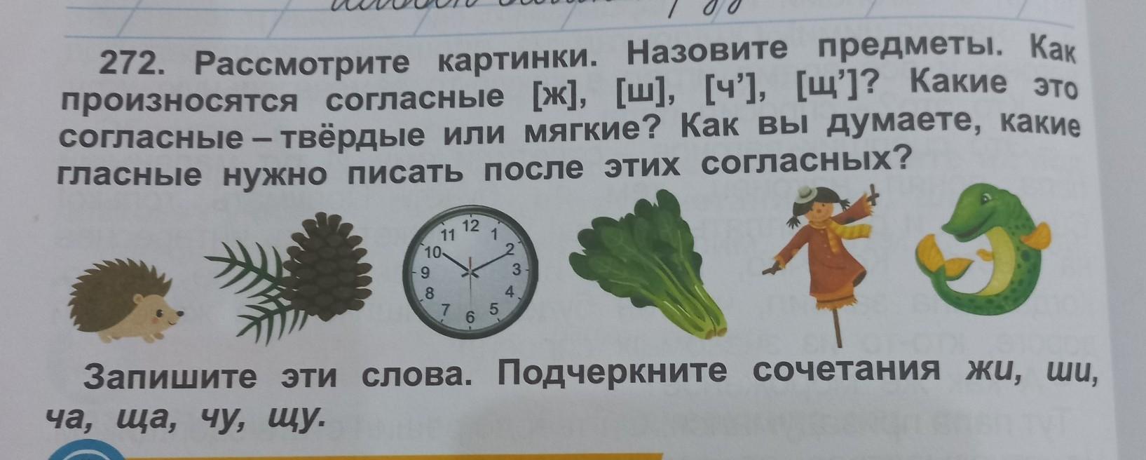 272. Рассмотрите картинки. Назовите предметы. Как согласные – твёрдые или Мягкие? Как вы думаете, какие произносятся согласные [ж], [ш], [ч'], [щ']? Какие это гласные нужно писать после этих согласных? - 12 11 10 9 8 Запишите эти слова. Подчеркните сочетания жи, ши, ча, ща, чу, щу.