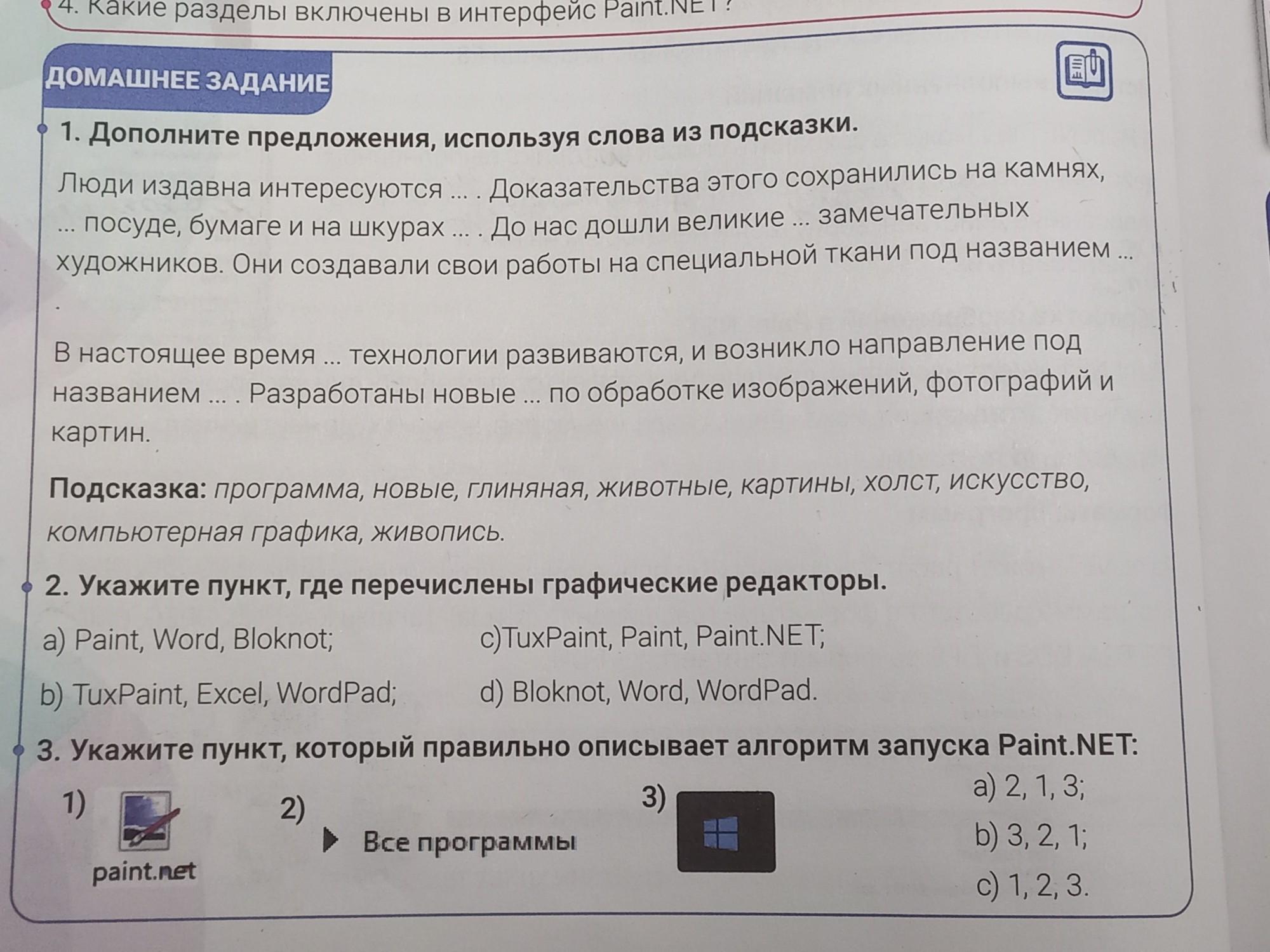 ДОМАШНЕЕ ЗАДАНИЕ 1. Дополните предложения, используя слова из подсказки. Люди издавна интересуются ... Доказательства этого сохранились на камнях, ... посуде, бумаге и на шкурах ... . До нас дошли великие ... замечательных художников. Они создавали свои работы на специальной ткани под названием ... В настоящее время ... технологии развиваются, и возникло направление под названием .... Разработаны новые ... по обработке изображений, фотографий и картин. Подсказка: программа, новые, глиняная, животные, картины, холст, искусство, Компьютерная графика, живопись.