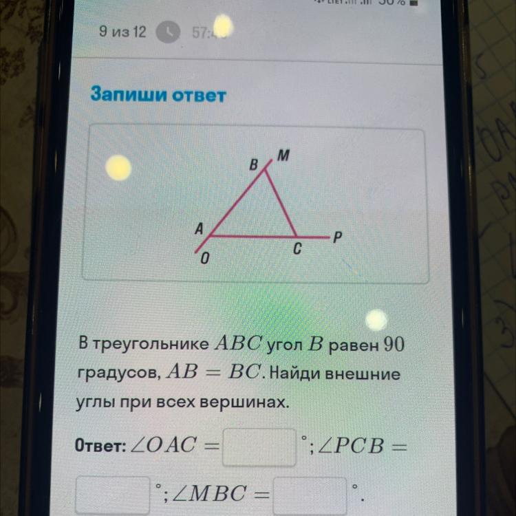 В треугольнике АВС угол В равен 90 градусов АВ=ВС найди внешние углы при всех вершинах