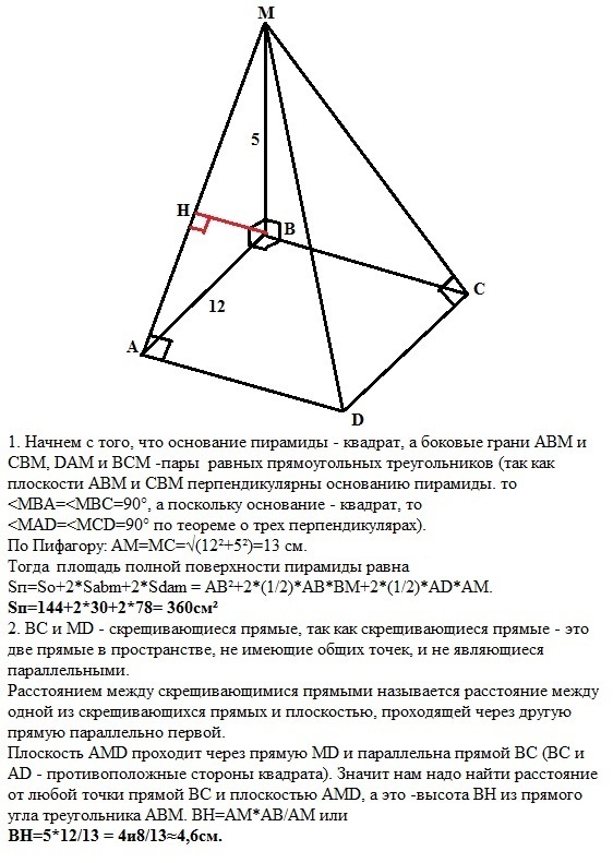 В основании пирамиды MABCD лежит квадрат ABCD со стороной, равной 12. Грани MBA и MBC перпендикулярны к плоскости основания. Высота пирамиды равна 5. Найдите площадь полной поверхности пирамиды. + В указанной выше пирамиде найдите расстояние между прямыми BC и MD.