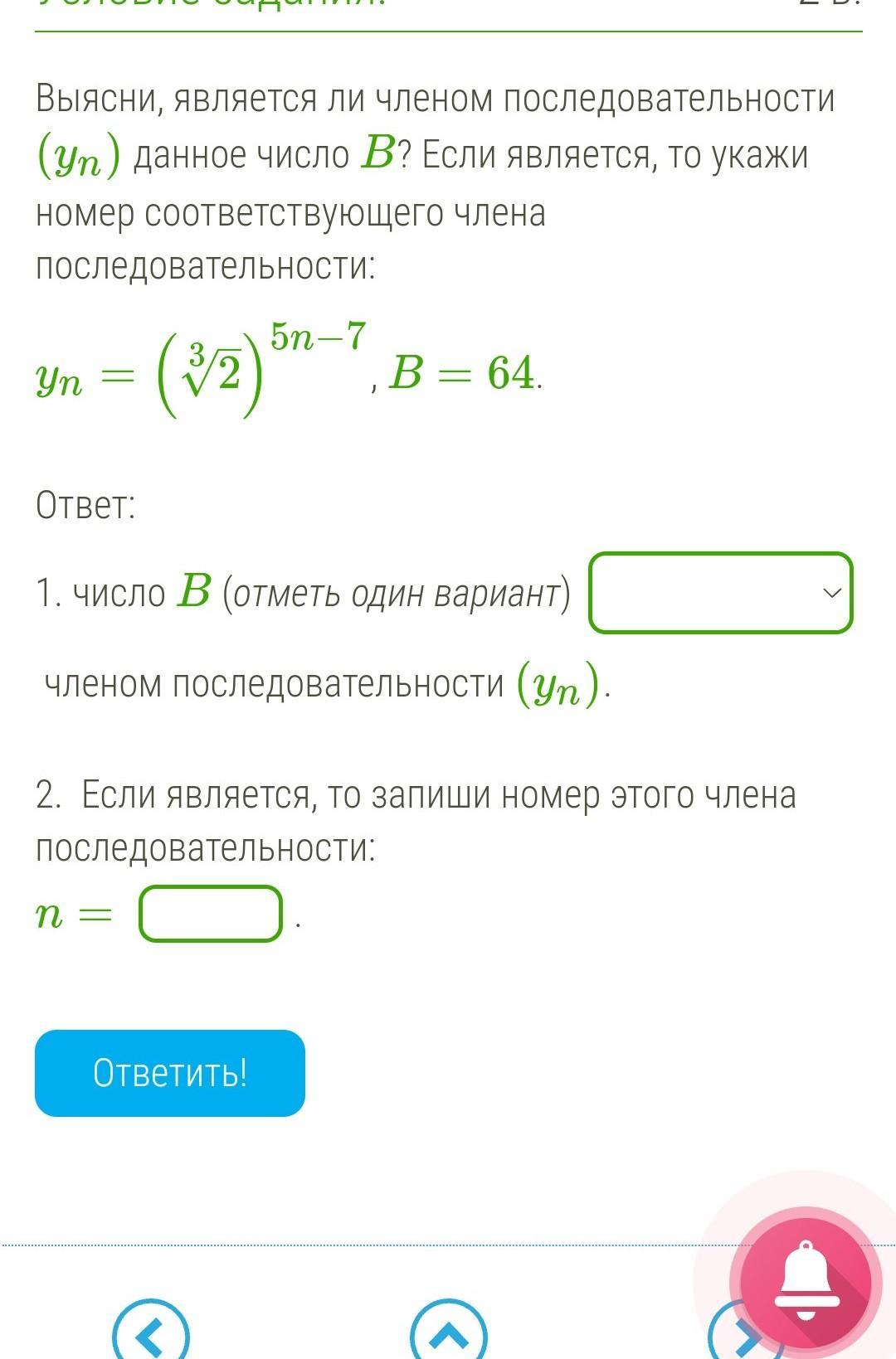 перепишем (∛2)⁵ⁿ⁻⁷=(2)⁽⁵ⁿ⁻⁷⁾/³, В=64=2⁶, если 2⁶ является членом последовательности, то выполняется при равных основаниях равенство показателей. а именно