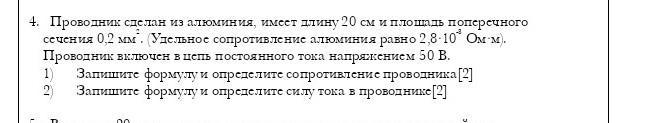 сечения 0.2 мм. Удельное сопротивление алюминия равно 2.8-10 Ом м Проводник включен в цепь постоянного тока напряжением 50 В 1) Запишите формулу и определите сопротивление проводни [2] Запишите формулу и определите силу тока в проводнике