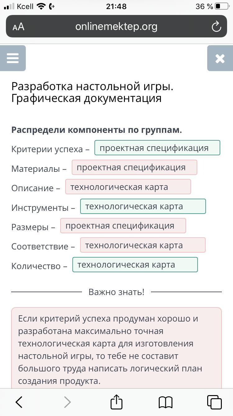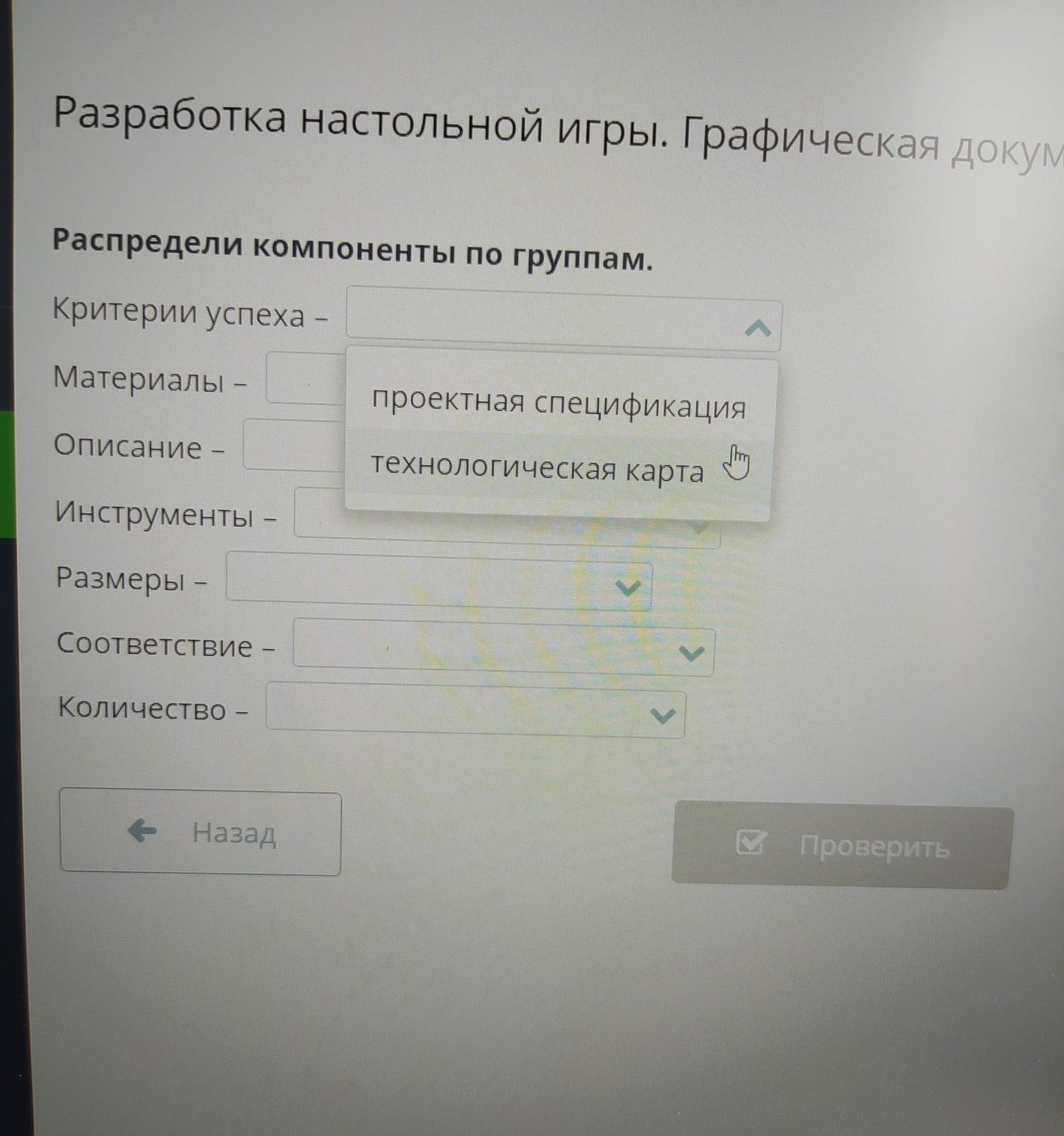 Разработка настольной игры. Графическая документация Распредели компоненты по группам. Критерии успеха - Материалы — Описание карта Инструменты — Размеры — к Соответствие – к Количество – Назад Г Проверить