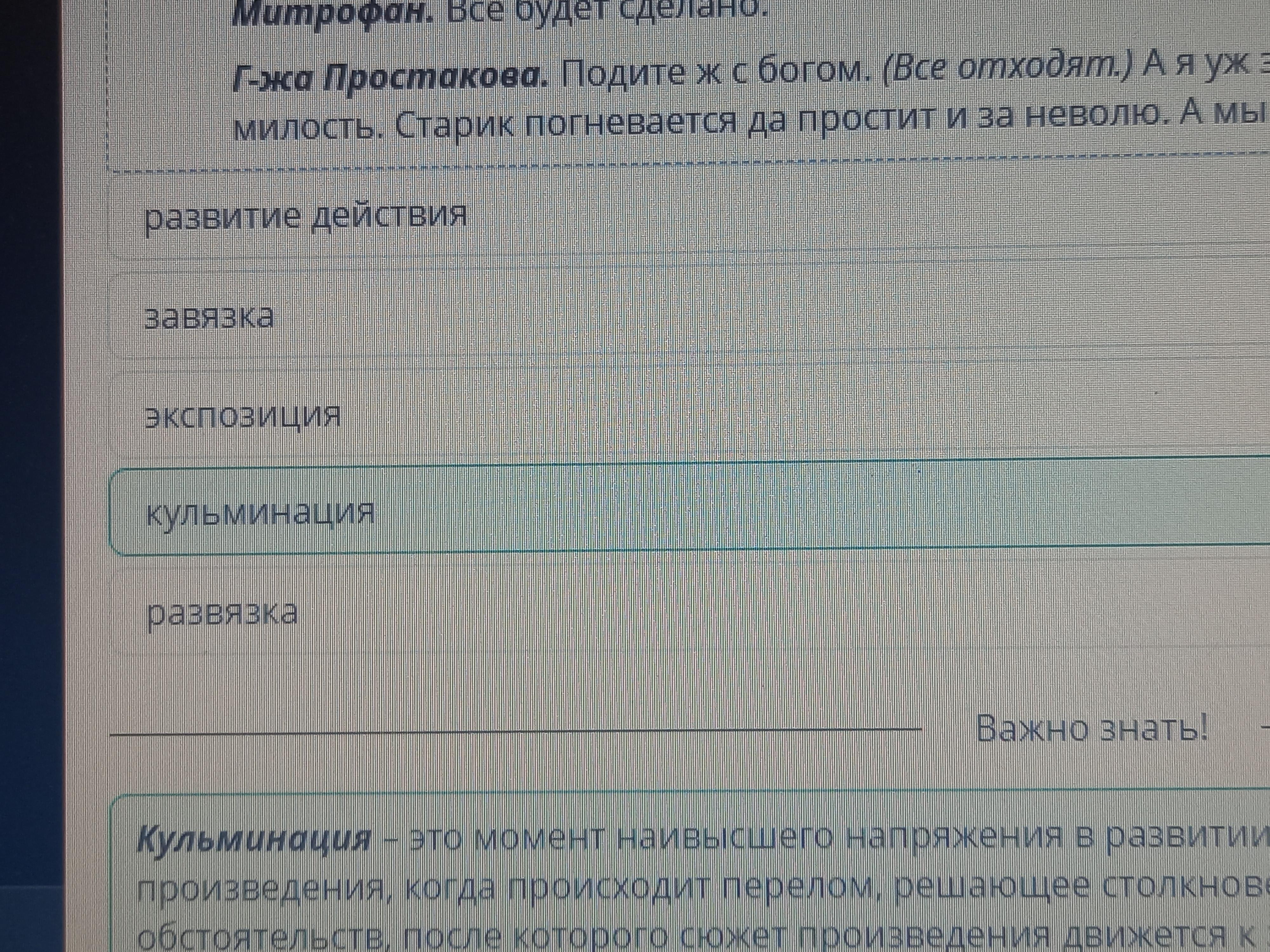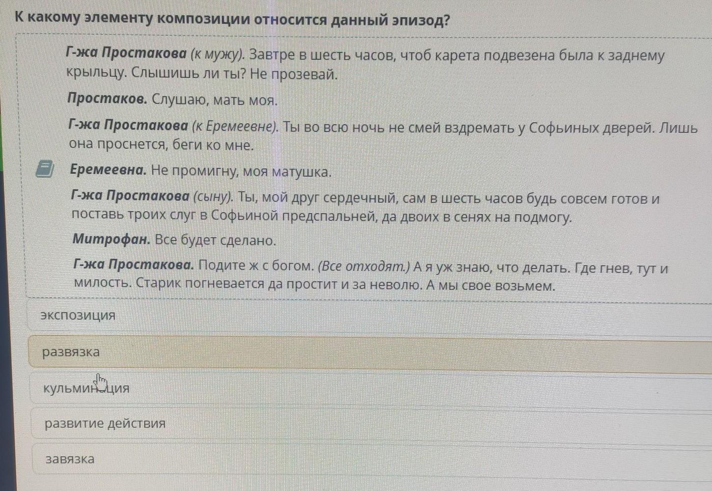 К какому элементу композиции относится данный эпизод? Г-жа Просмакова (к мужу). Зантре в шесть часов, чтоб карета подвезена была к заднему крыльцу. Слышишь ли ты? Не прозевай Просмаков. Спущаю, мать моя Г-жа Просмакова (к Еремеевне). Ты по всю ночь не смей падремать у Софьиных дверей, лишь она проснется, беги ко мне Ерeмeсaнa. He промигну, моя матушка. Г-жа Просмаково (cury) Ты, мой друг сердечный, сам в шесть часов будь совсем готов и поставь троих слуг в Софьиной предспальней, да двоих в сенях на подмогу. Г-жа Просмакова. Подите к с богом (Все отходят! А я уж знаю, что делать Где гнев, тут и Митрофан. Все будет сделано милость. Старик погневается да простит и за неволю. А мы спре возьмем