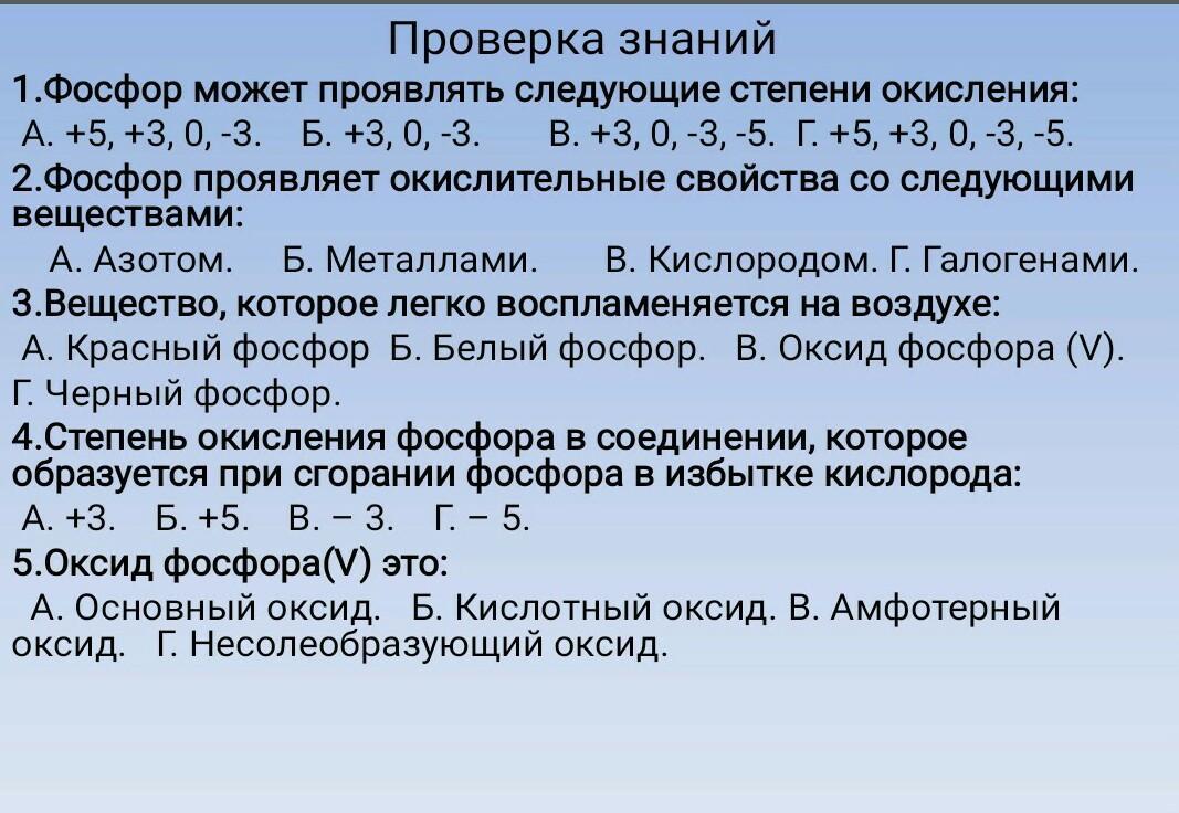 Фосфор может проявлять следующие степени окисления: А. +5, +3, 0, -3. Б. +3, 0, -3. свойства В. +3, 0, -3, -5. Г. +5, +3, 0, -3, -5.