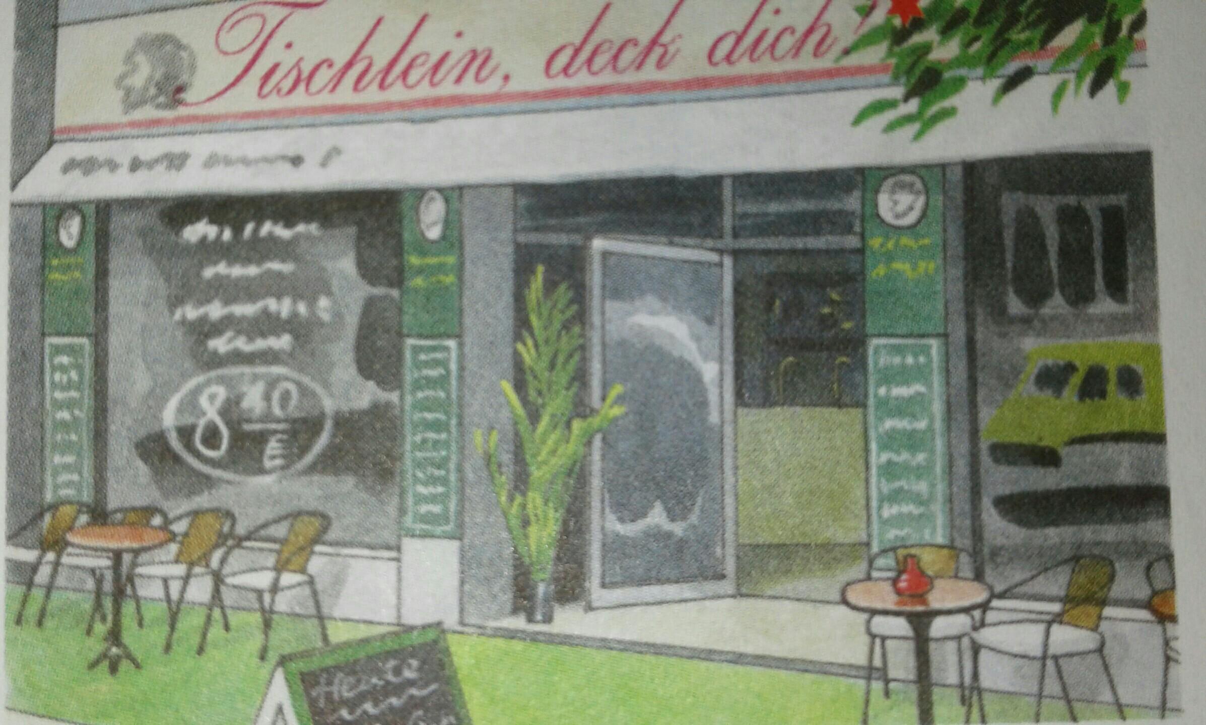 Ich sehe ein stimmungsvolles Café voller Glück und Freude namens Fischlein, deck dich. Auch dieser grüne Teppich, der so andeutet, dass es hier nicht traurig werden wird.