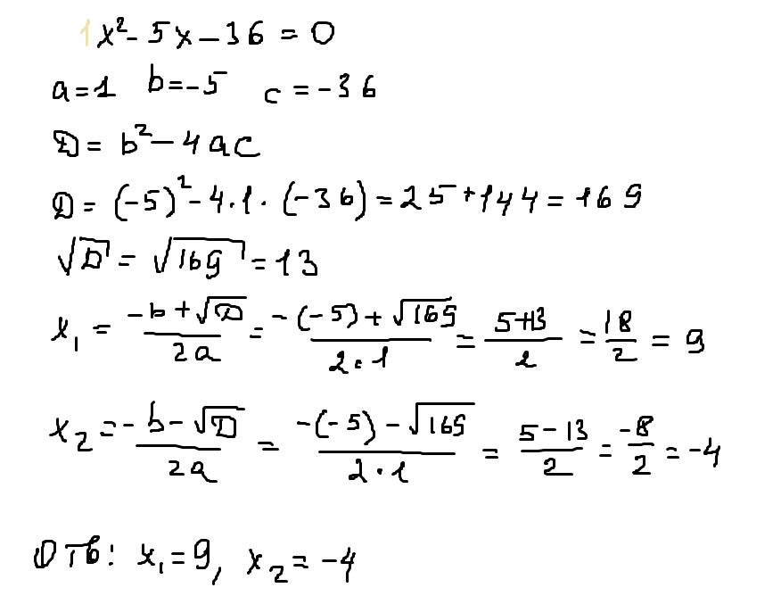 Д=(-5)^2-4*1*(-36)=*корень квадратный*169=13