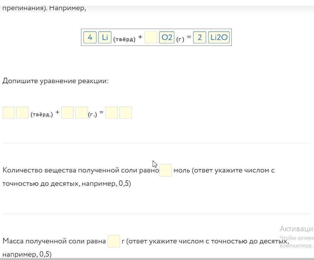 Составляя уравнение реакции, в первом поле арабскими цифрами укажите коэффициент, без пробелов и других лишних знаков препинания (коэффициент, равный , не ставится, оставьте поле пустым; дробные и кратные коэффициенты недопустимы), во втором поле укажите латиницей пропущенное вещество (без пробелов и других лишних знаков препинания). Например,