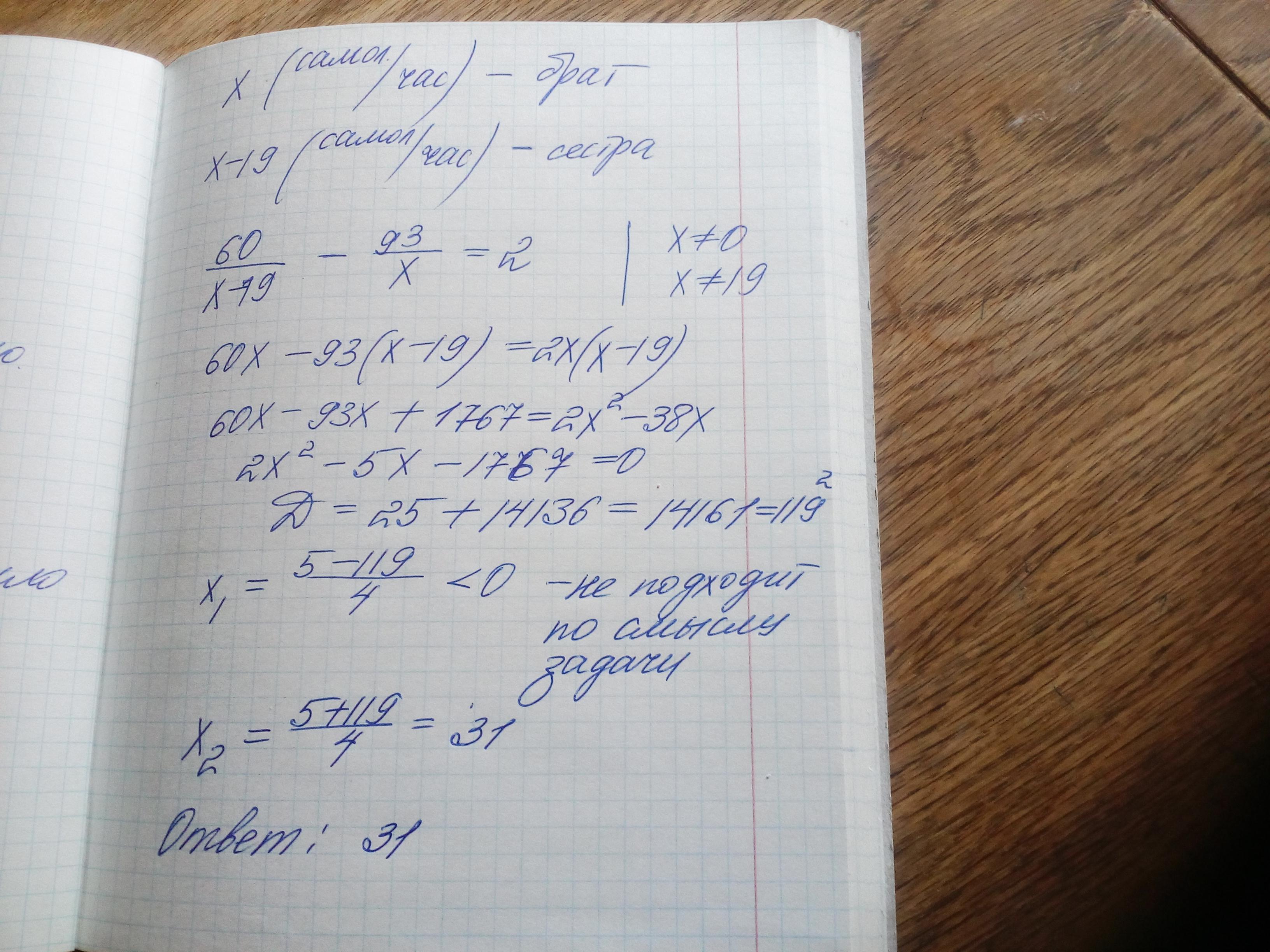 Брат с сестрой решили делать бумажные самолетики. чтобы сложить 60 самолетиков, сетре нужно на 2 часа больше, чем брату на складывание 93 самолетиков. известно, что за 1 час сестра складывает на 19 самолетиков меньше, чем брат. сколько самолетиков час складывает брат?