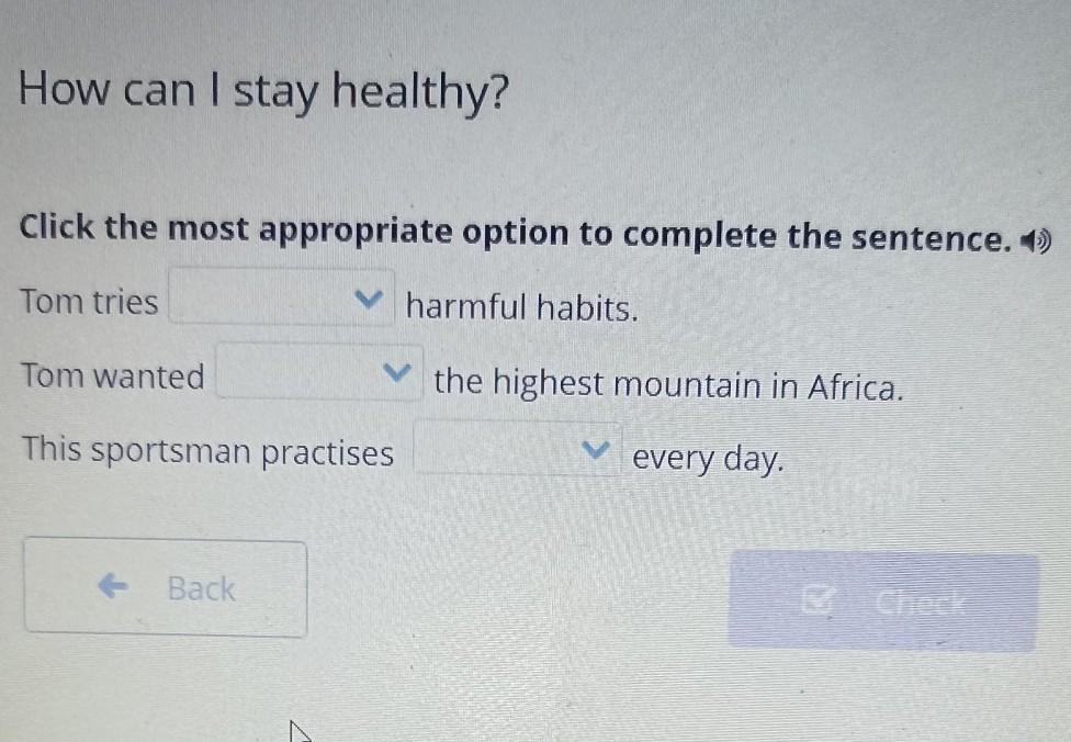 How can I stay healthy? Click the most appropriate option to complete the sentence. 1) Tom tries harmful habits. Tom wanted the highest mountain in Africa. This sportsman practises every day. Back Check