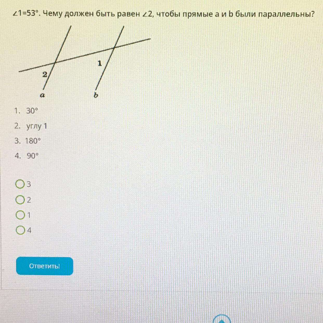 1=53°. Чему должен быть равен 2, чтобы прямые а и b были параллельны?