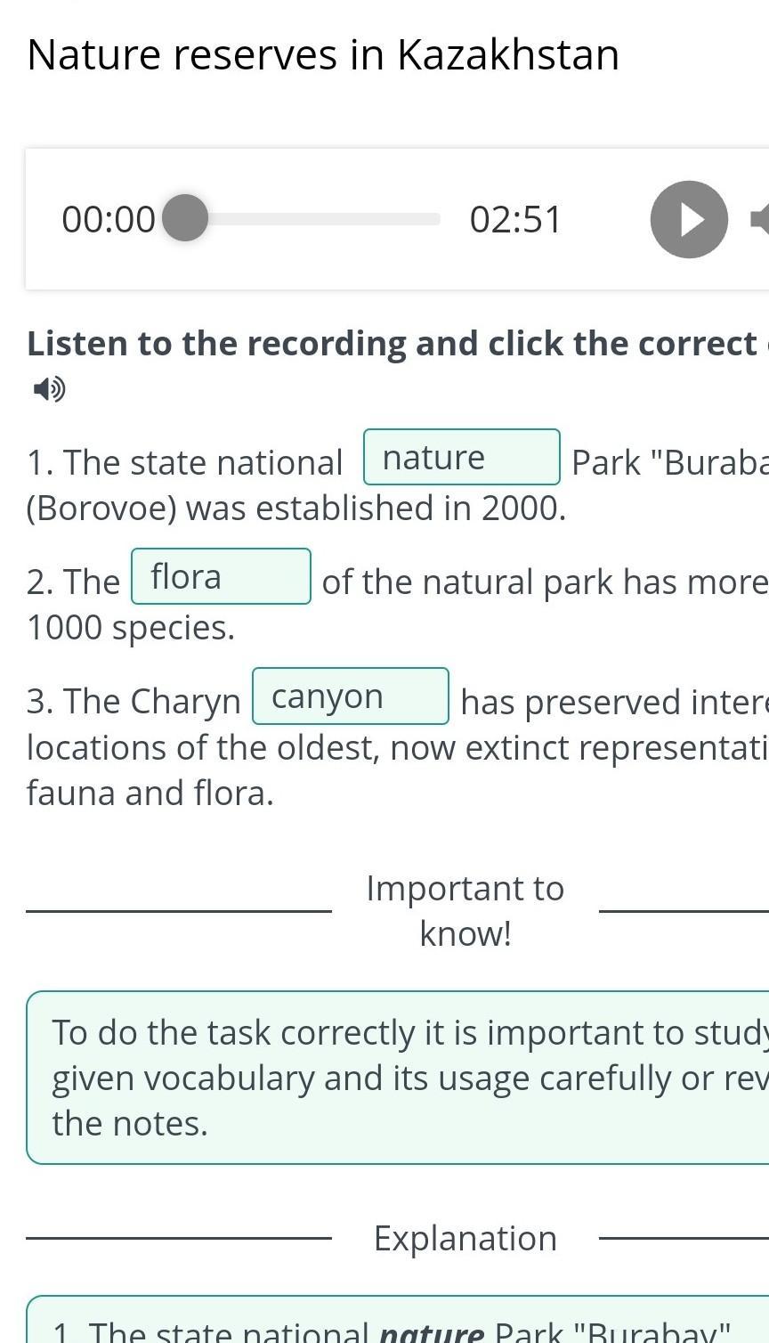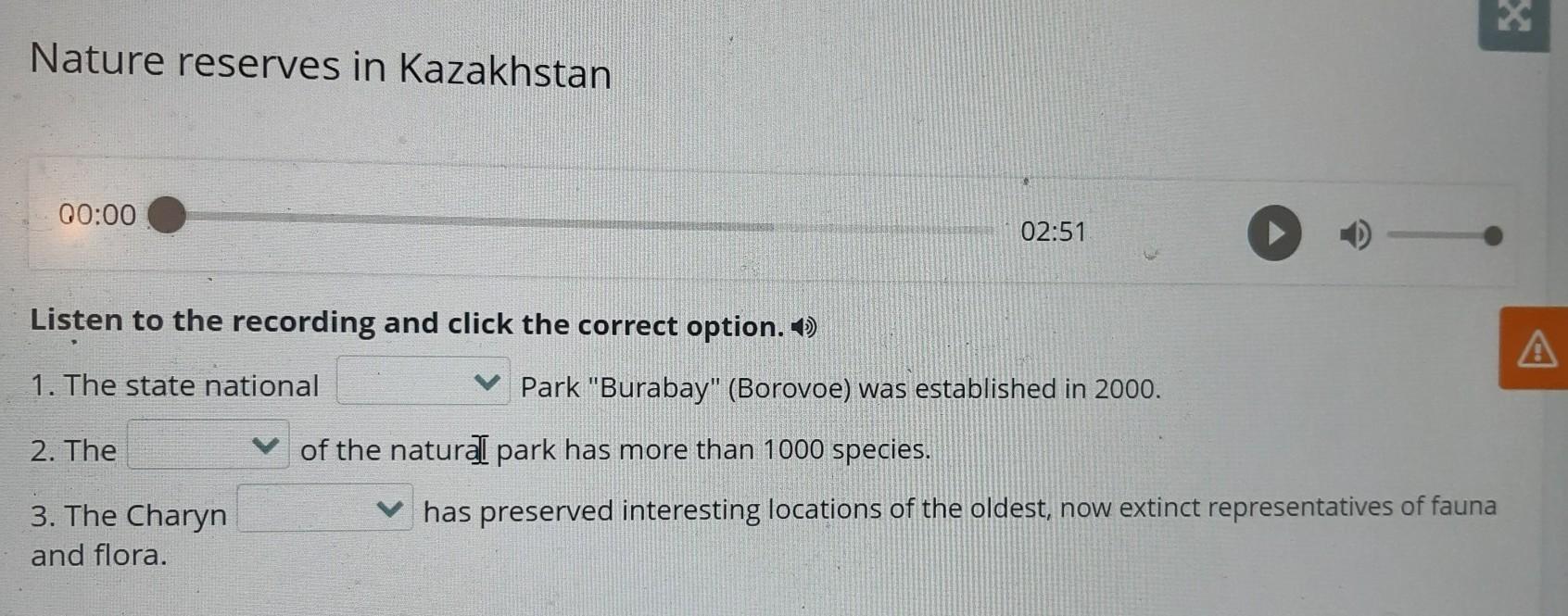 x Nature reserves in Kazakhstan 00:00 02:51 0 Listen to the recording and click the correct option. 1)) A 1. The state national Park "Burabay" (Borovoe) was established in 2000. 2. The of the natural park has more than 1000 species. has preserved interesting locations of the oldest, now extinct representatives of fauna 3. The Charyn and flora.