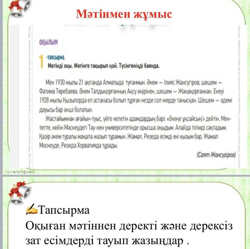 Оқыған мәтіннен деректі және дерексіз зат есімдерді тауып жазыңдар .