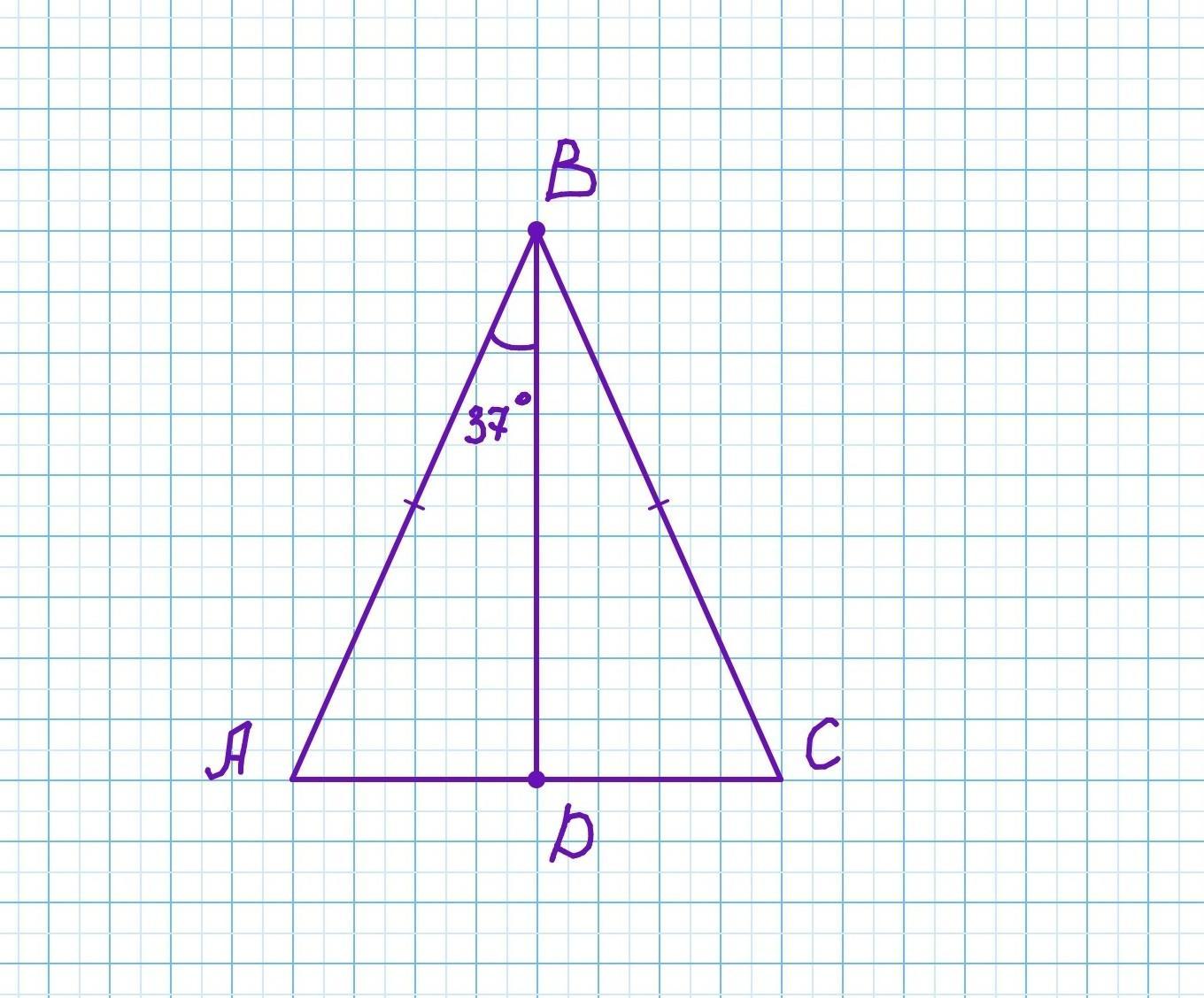 в трикутнику ABC проведена медіана BD. кут ABD = 37. знайдіть кути трикутника ABC, якщо дідомо, що AB=BC. помогите пожалуйста