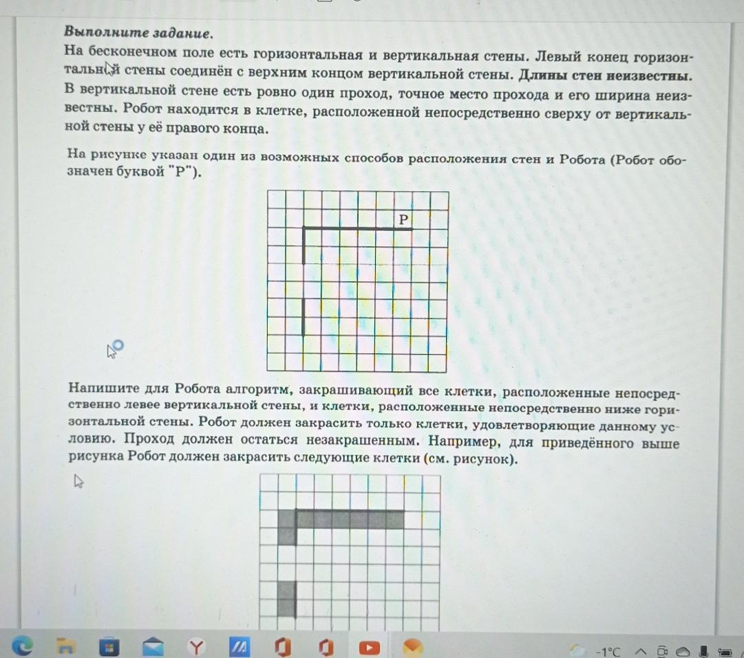 Выполните задание. На бесконечном поле есть горизонтальная и вертикальная стены. Левый конец горизон- тальной стены соединён с верхним концом вертикальной стены. Длины стен неизвестны. В вертикальной стене есть ровно один проход, точное место прохода и его ширина неиз- вестны. Робот находится в клетке, расположенной непосредственно сверху от вертикаль- ной стены у её правого конца. На рисунке указан один из возможных способов расположения стен и Робота (Робот обо- значен буквой "P"). P Напишите для Робота алгоритм, закрашивающий все клетки, расположенные непосред- ственно левее вертикальной стены, и клетки, расположенные непосредственно ниже гори- зонтальной стены. Робот должен закрасить только клетки, удовлетворяющие данному ус- ловию. Проход должен остаться незакрашенным. Например, для приведённого выше рисунка Робот должен закрасить следующие клетки (см. рисунок). - -