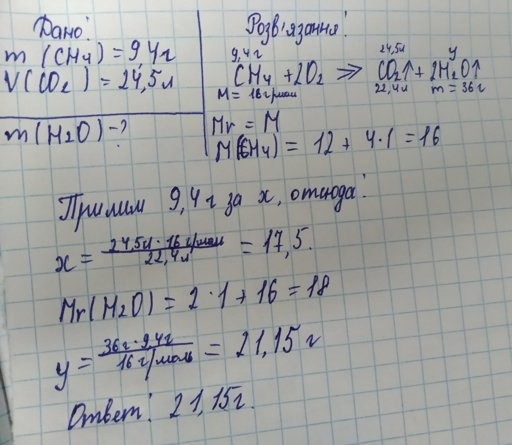 При полном сгорании массы 9,4 г метана в результате реакции образуется 24,5 л углекислого газа. Найдите объем образовавшегося газа и массу воды.