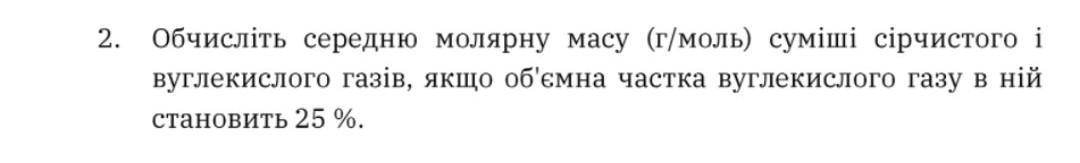 2. Вычислите среднюю молярную массу (г/моль) смеси сернистого и углекислого газов, если объемная доля углекислого газа в ней составляет 25%.