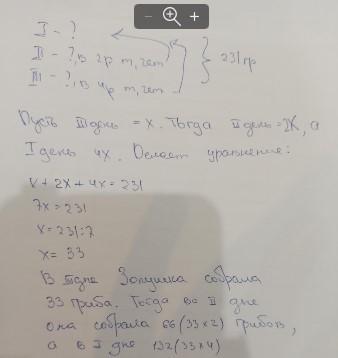 Золушка собрала 231 грибов за 3 дня .сколько грибов она собирала если в первый день она собрала в два раза больше чем во второй и в четыре раза больше чем в третий
