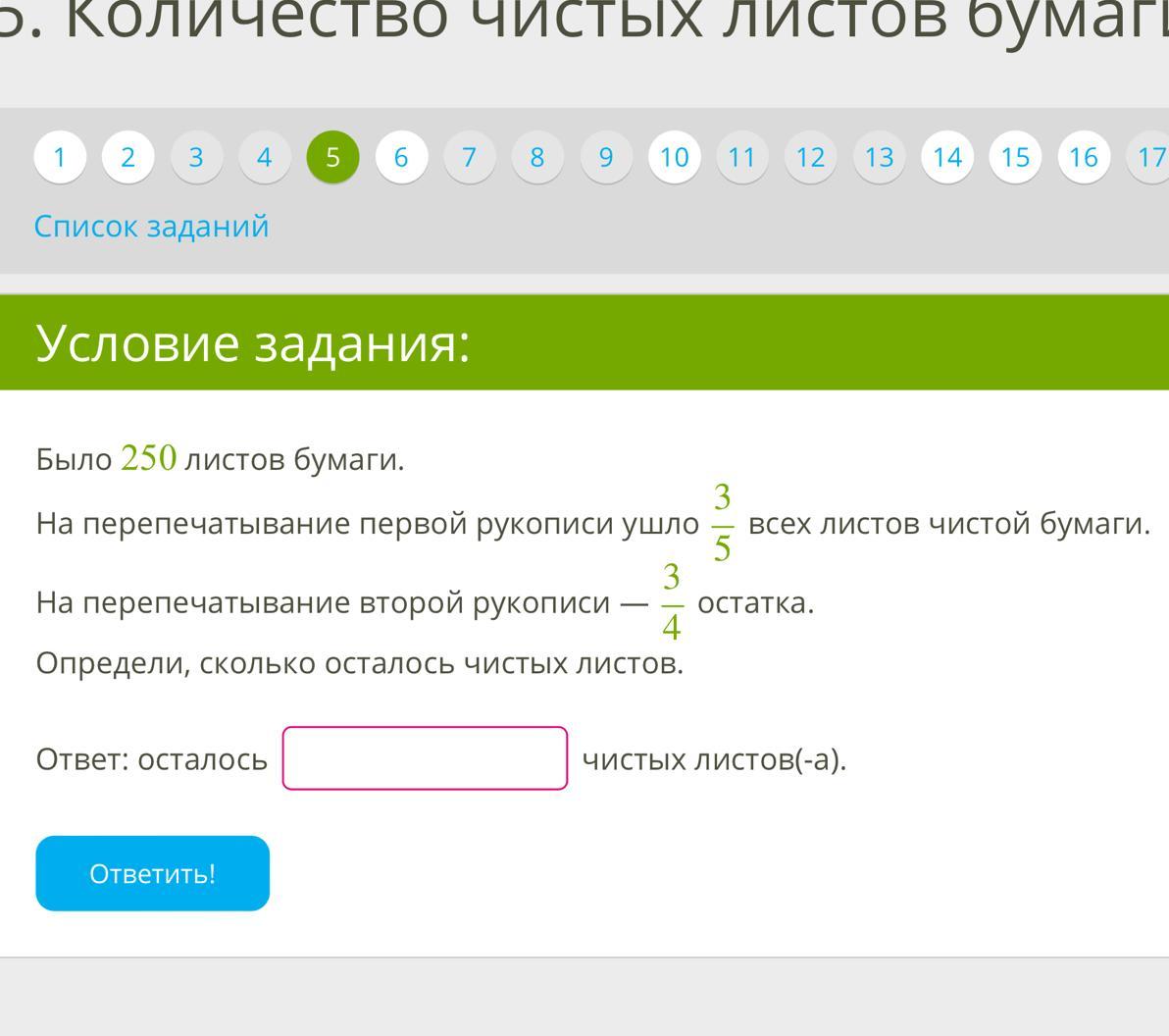 1) 250:5=50 (Листов)-1/5 часть всей бумаги