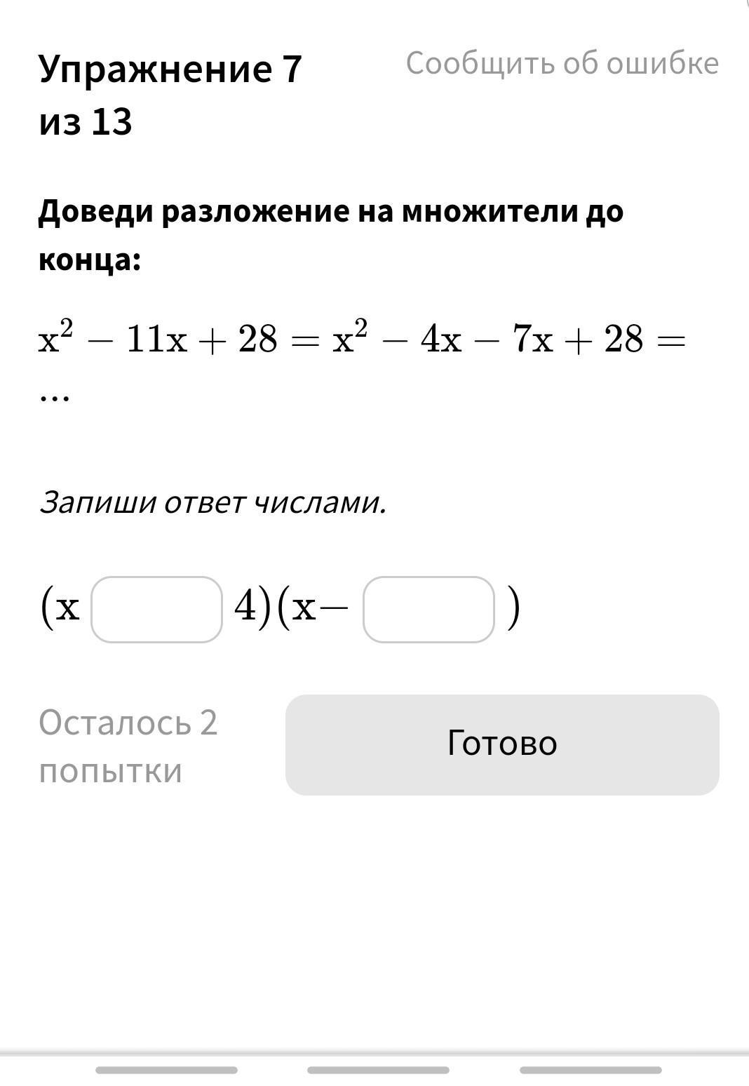 х²-11х+28=х²-4х-7х+28=х*(х-4)-7(х-4)=(х-4)(х-7)