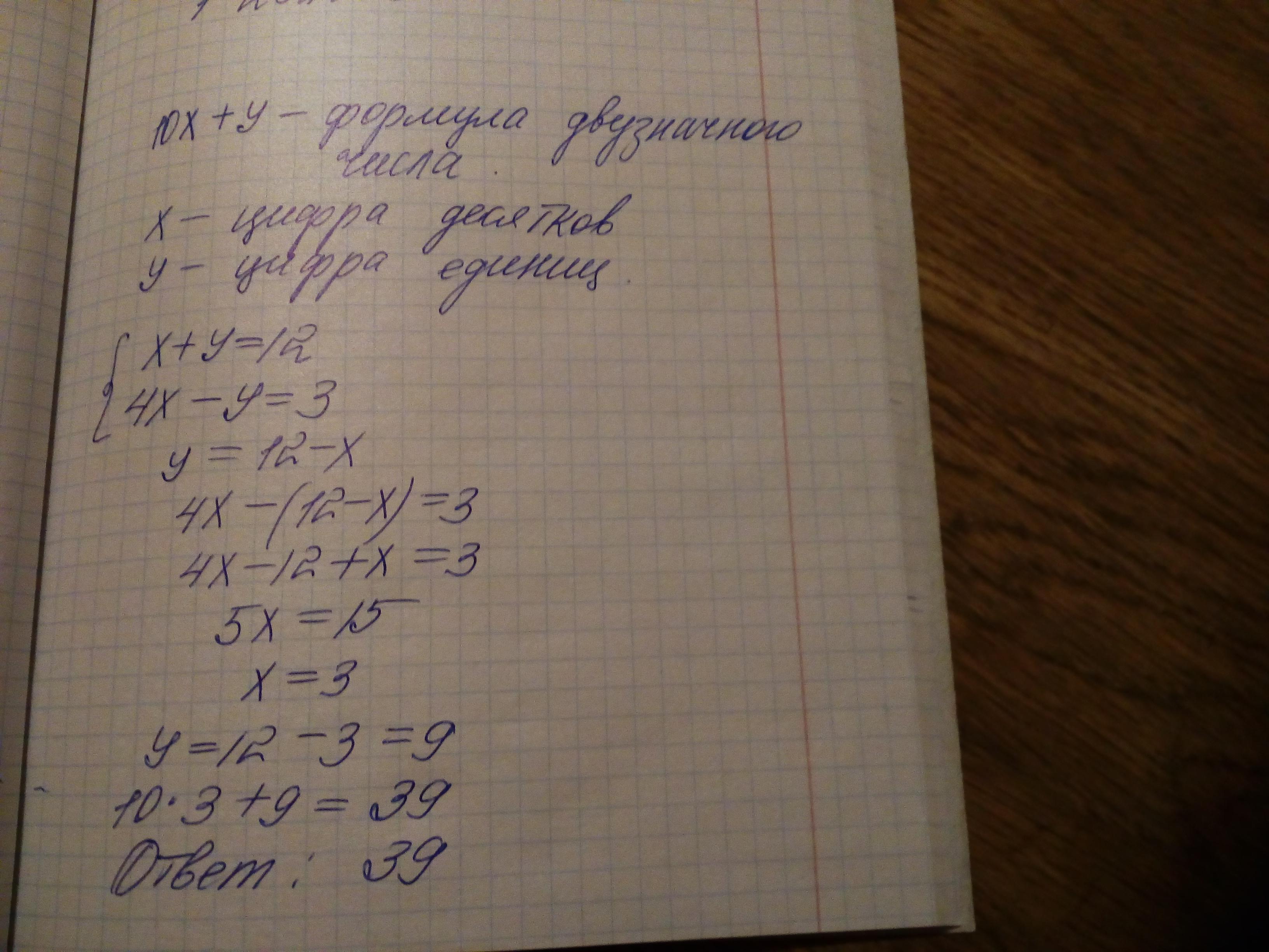 Сумма цифр двузначного числа равна 12. Учетверенная цифра десятков больше цифры единиц на 3. Найти это двузначное число.