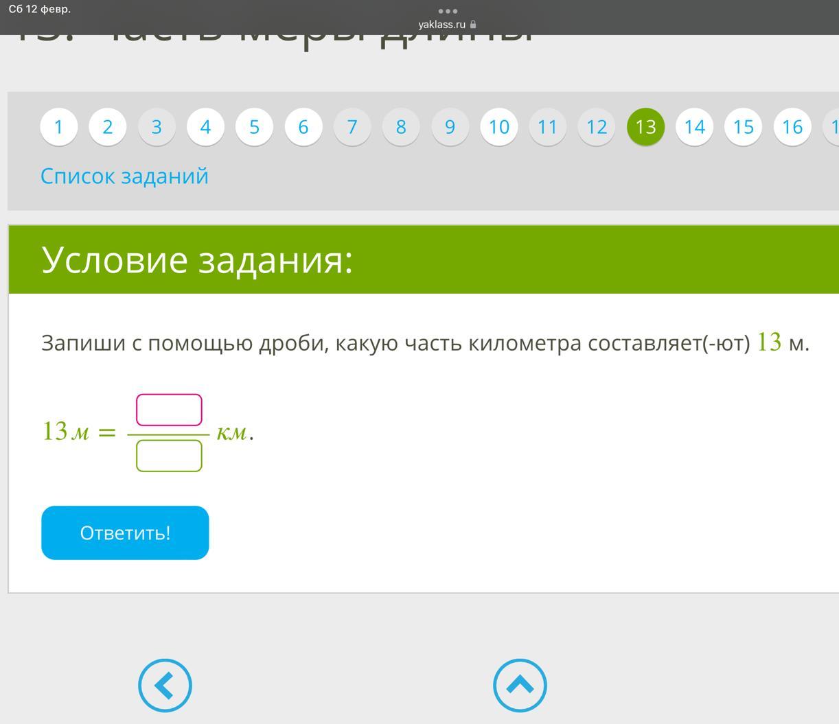 Запиши с помощью дроби, какую часть километра составляет(-ют) 13 м.