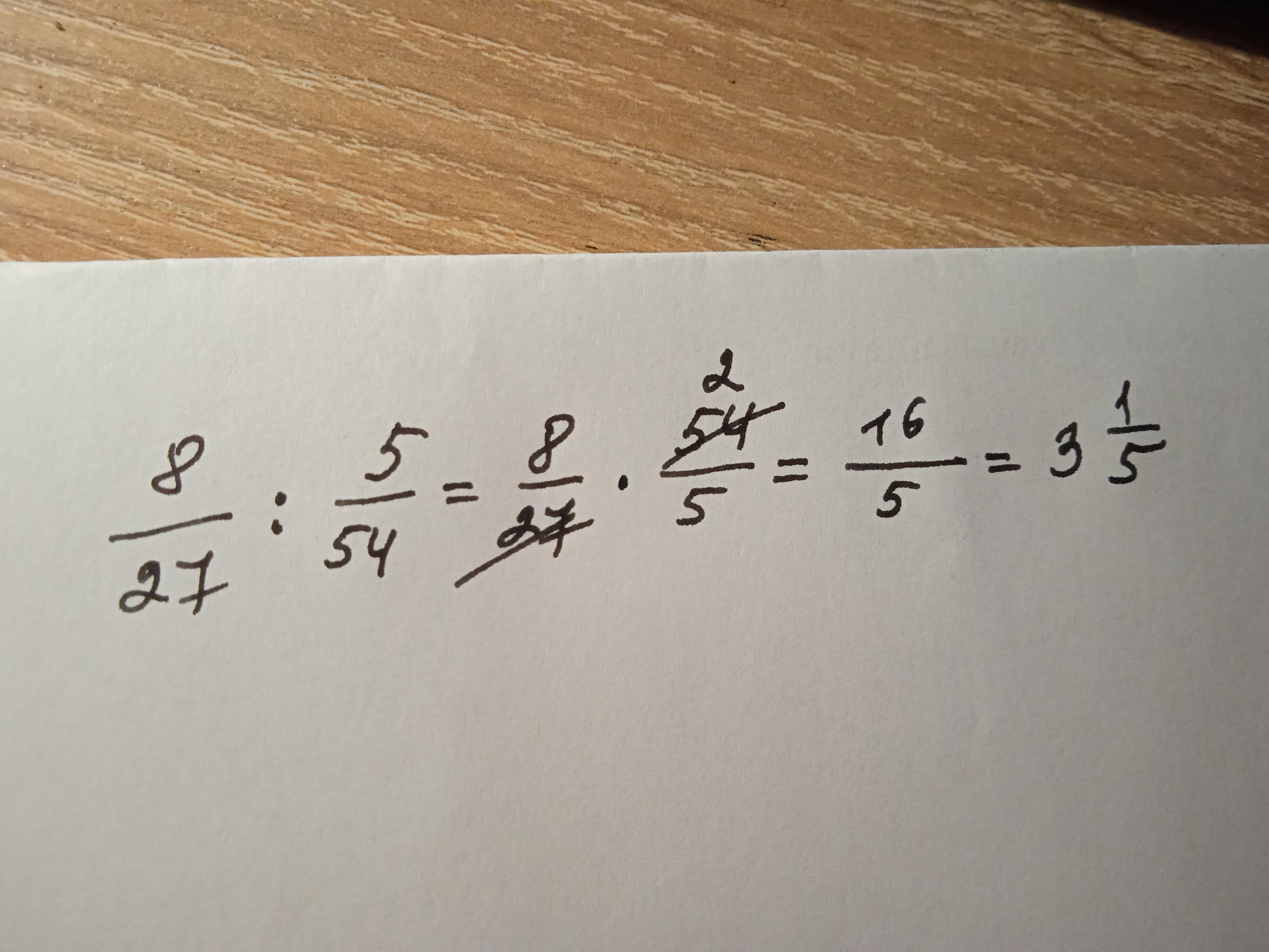 8/27 : 5/54 = 8/27 × 54/5 = 8×2/1×5= 16/5= 3 целых 1/5