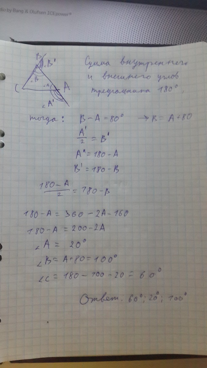В треугольнике АВС угол А меньше угла В на 80 градусов, а внешний уголпри вершине А больше внешнего угла при вершине В в 2 раза. Найдите внутренние углы треугольника АВС